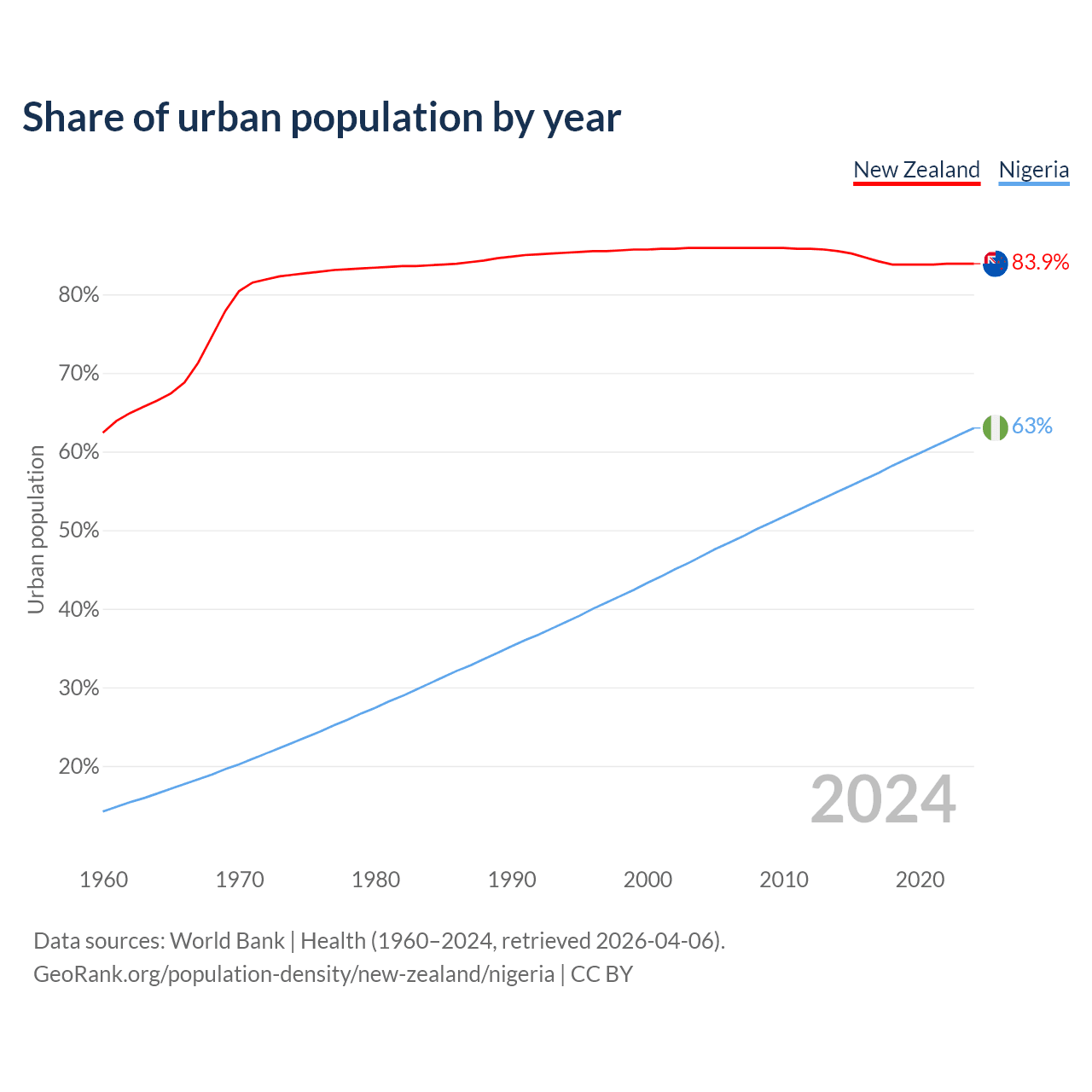 From 2004 to 2024, the share of urban population changed from 85.9% to 83.9% in New Zealand and from 46.7% to 63% in Nigeria.