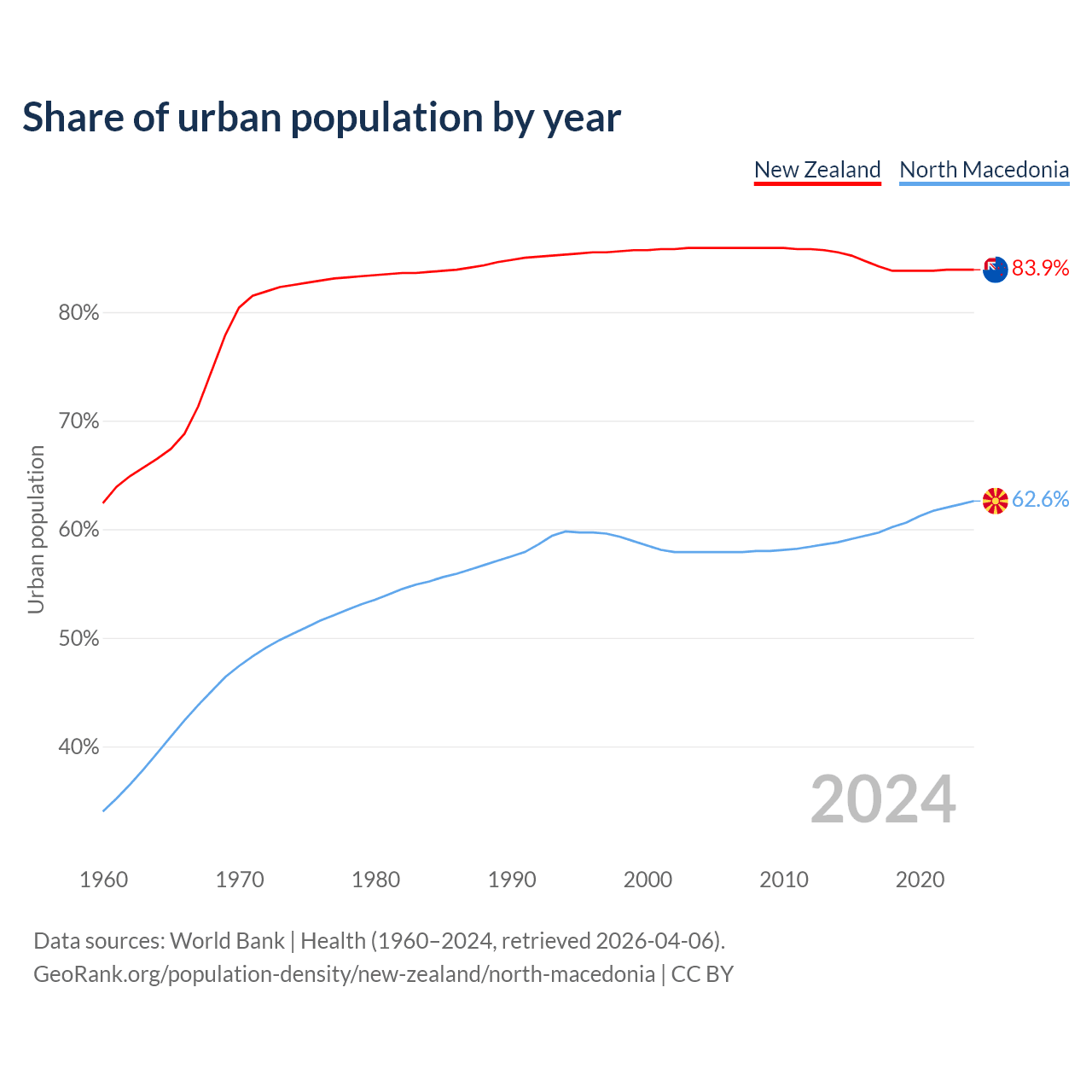 From 2004 to 2024, the share of urban population changed from 85.9% to 83.9% in New Zealand and from 57.9% to 62.6% in North Macedonia.