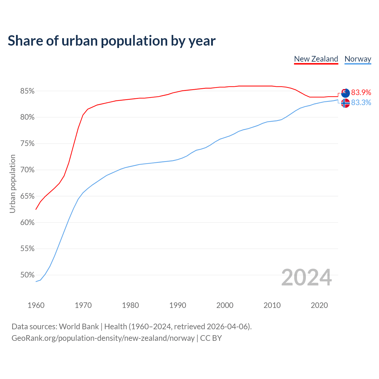 From 2004 to 2024, the share of urban population changed from 85.9% to 83.9% in New Zealand and from 77.6% to 83.3% in Norway.