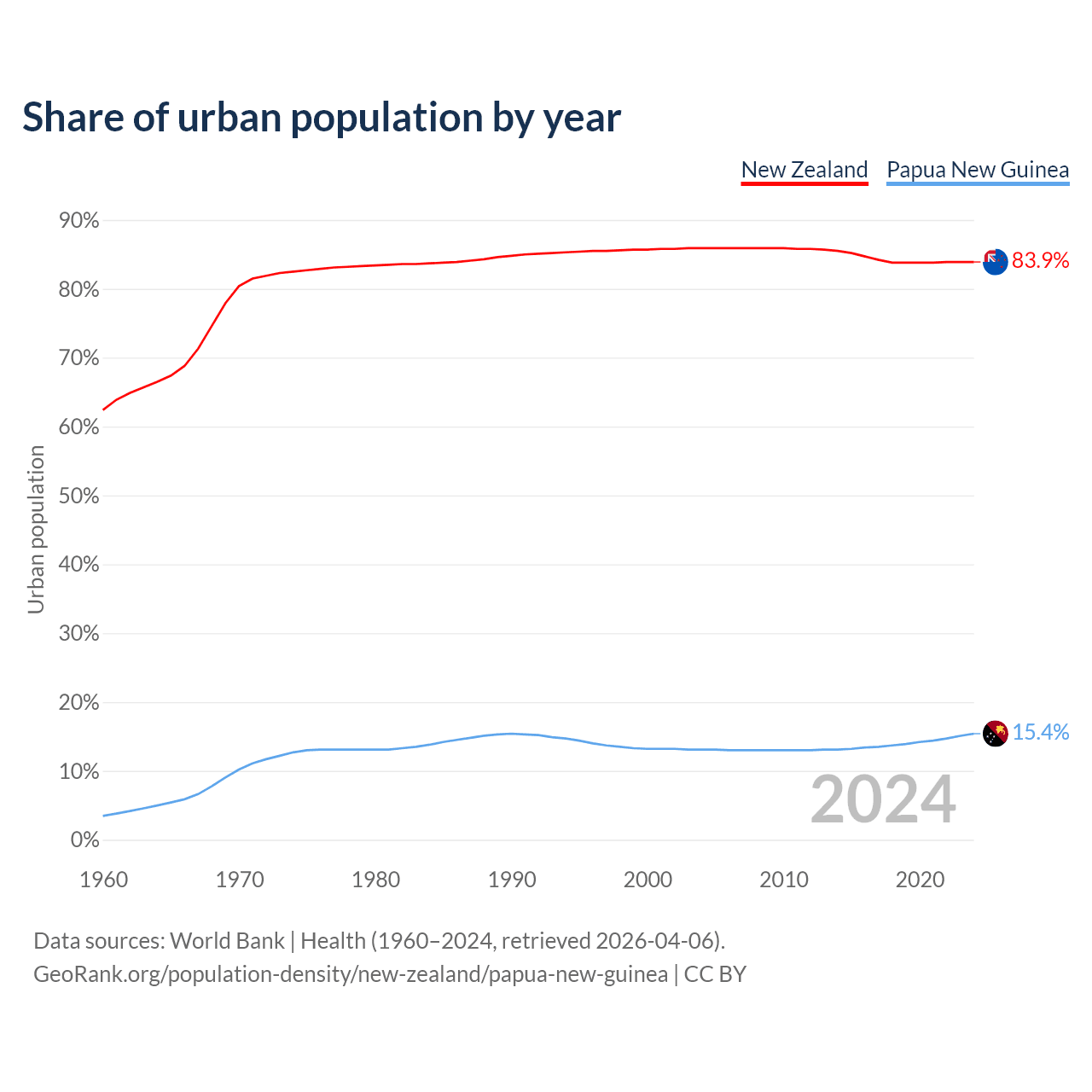 From 2004 to 2024, the share of urban population changed from 85.9% to 83.9% in New Zealand and from 13.1% to 15.4% in Papua New Guinea.