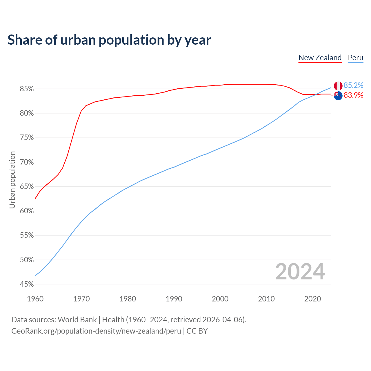 From 2004 to 2024, the share of urban population changed from 85.9% to 83.9% in New Zealand and from 74.4% to 85.2% in Peru.