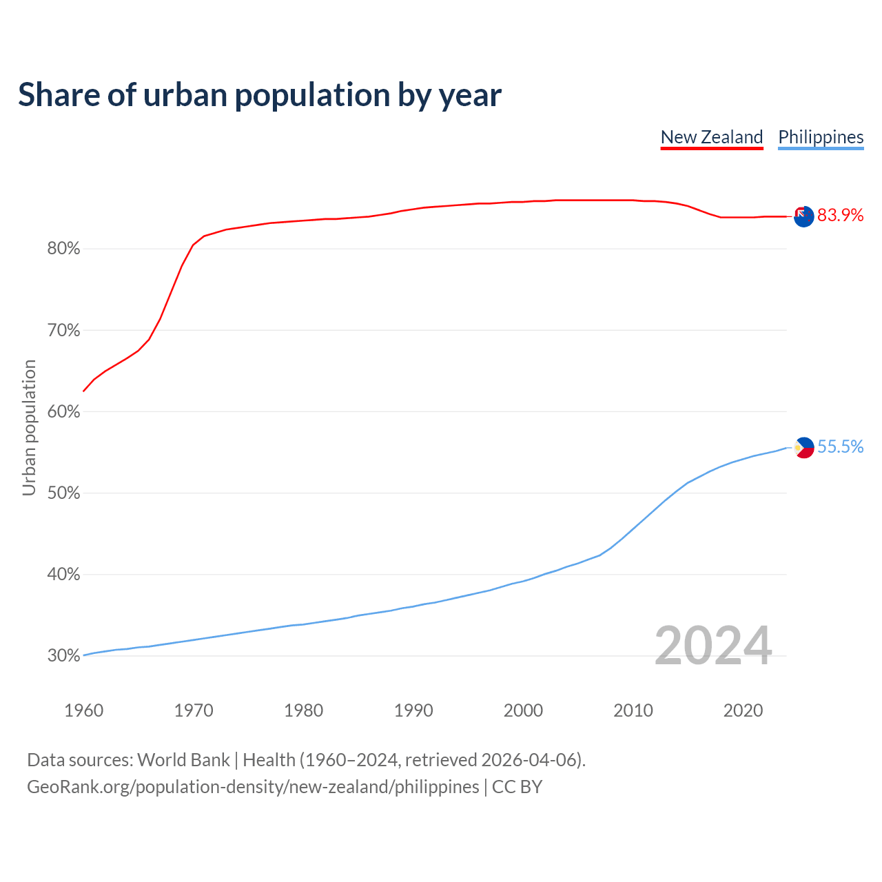 From 2004 to 2024, the share of urban population changed from 85.9% to 83.9% in New Zealand and from 40.9% to 55.5% in the Philippines.