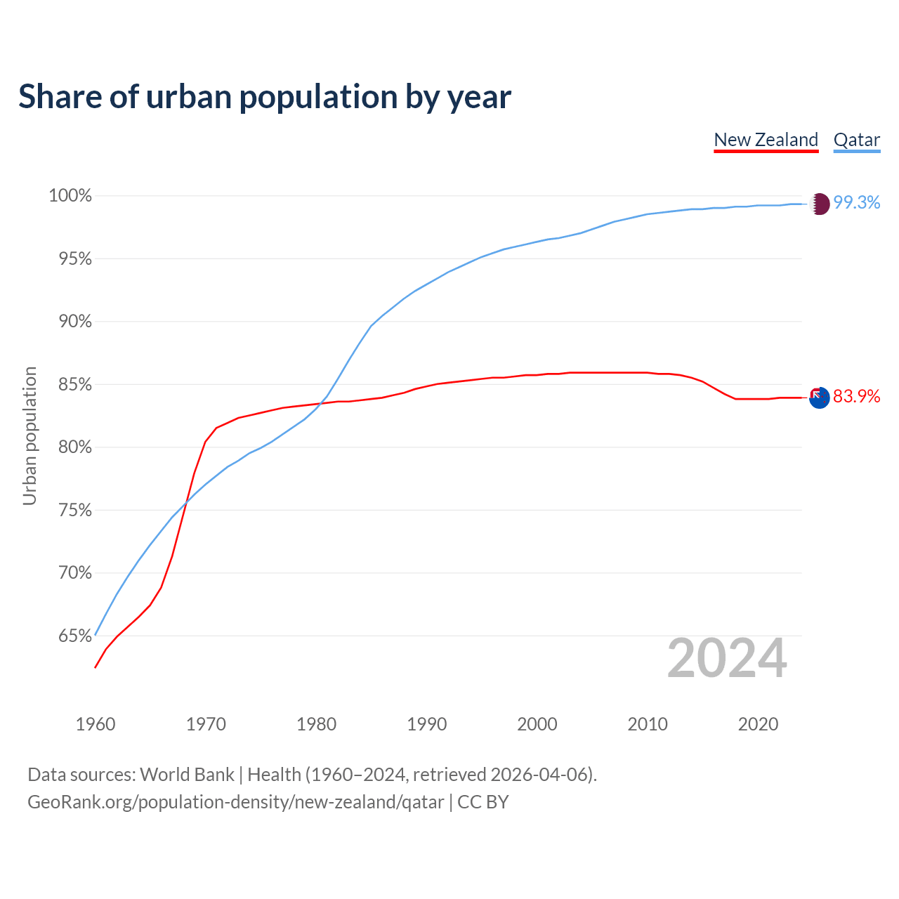 From 2004 to 2024, the share of urban population changed from 85.9% to 83.9% in New Zealand and from 97% to 99.3% in Qatar.