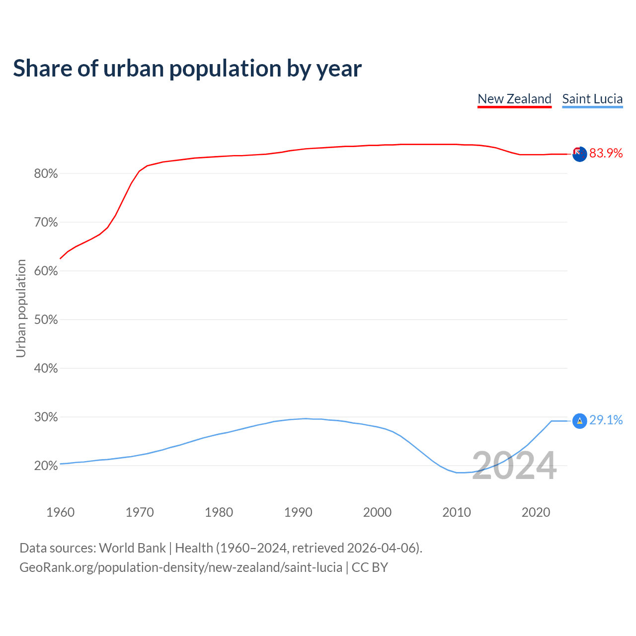 From 2004 to 2024, the share of urban population changed from 85.9% to 83.9% in New Zealand and from 24.8% to 29.1% in Saint Lucia.