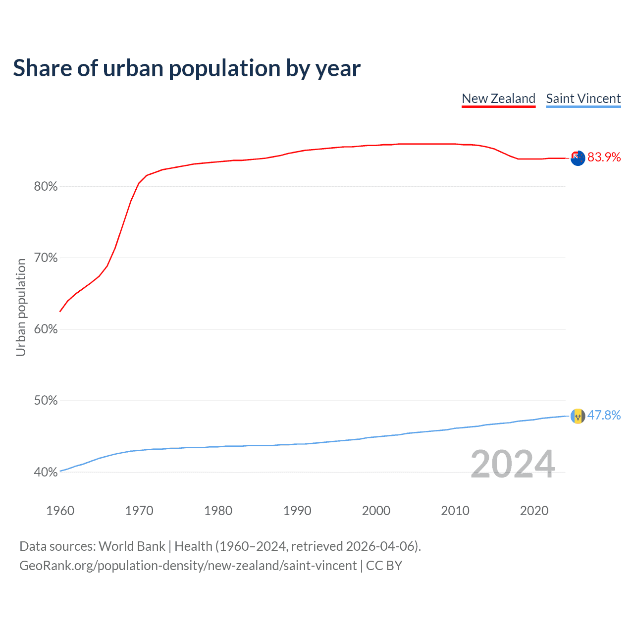 From 2004 to 2024, the share of urban population changed from 85.9% to 83.9% in New Zealand and from 45.4% to 47.8% in Saint Vincent.