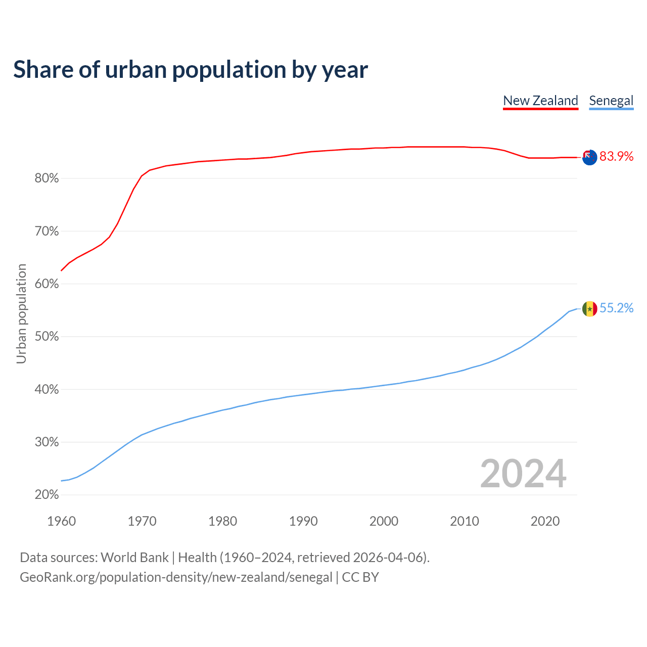 From 2004 to 2024, the share of urban population changed from 85.9% to 83.9% in New Zealand and from 41.6% to 55.2% in Senegal.