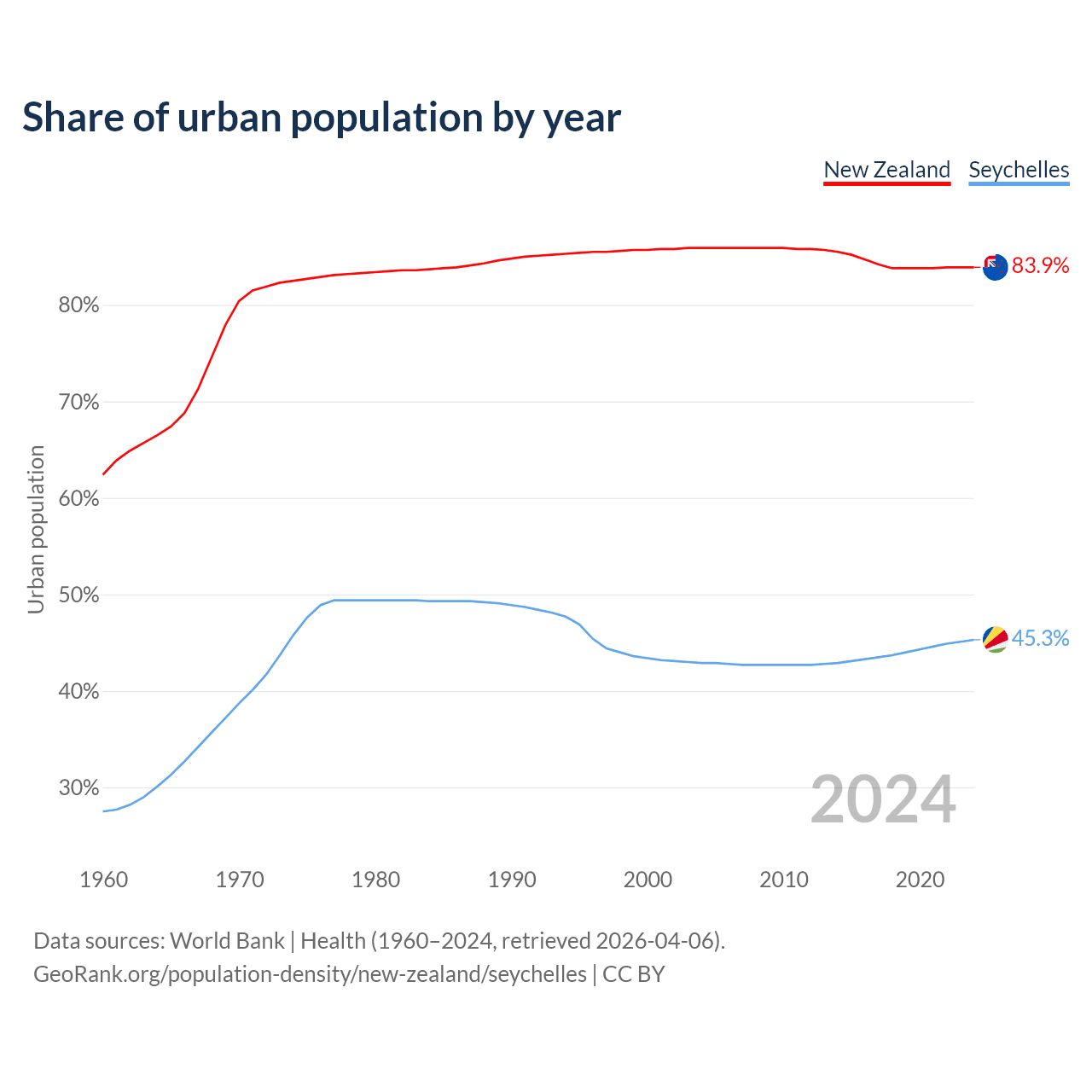 From 2004 to 2024, the share of urban population changed from 85.9% to 83.9% in New Zealand and from 42.9% to 45.3% in the Seychelles.