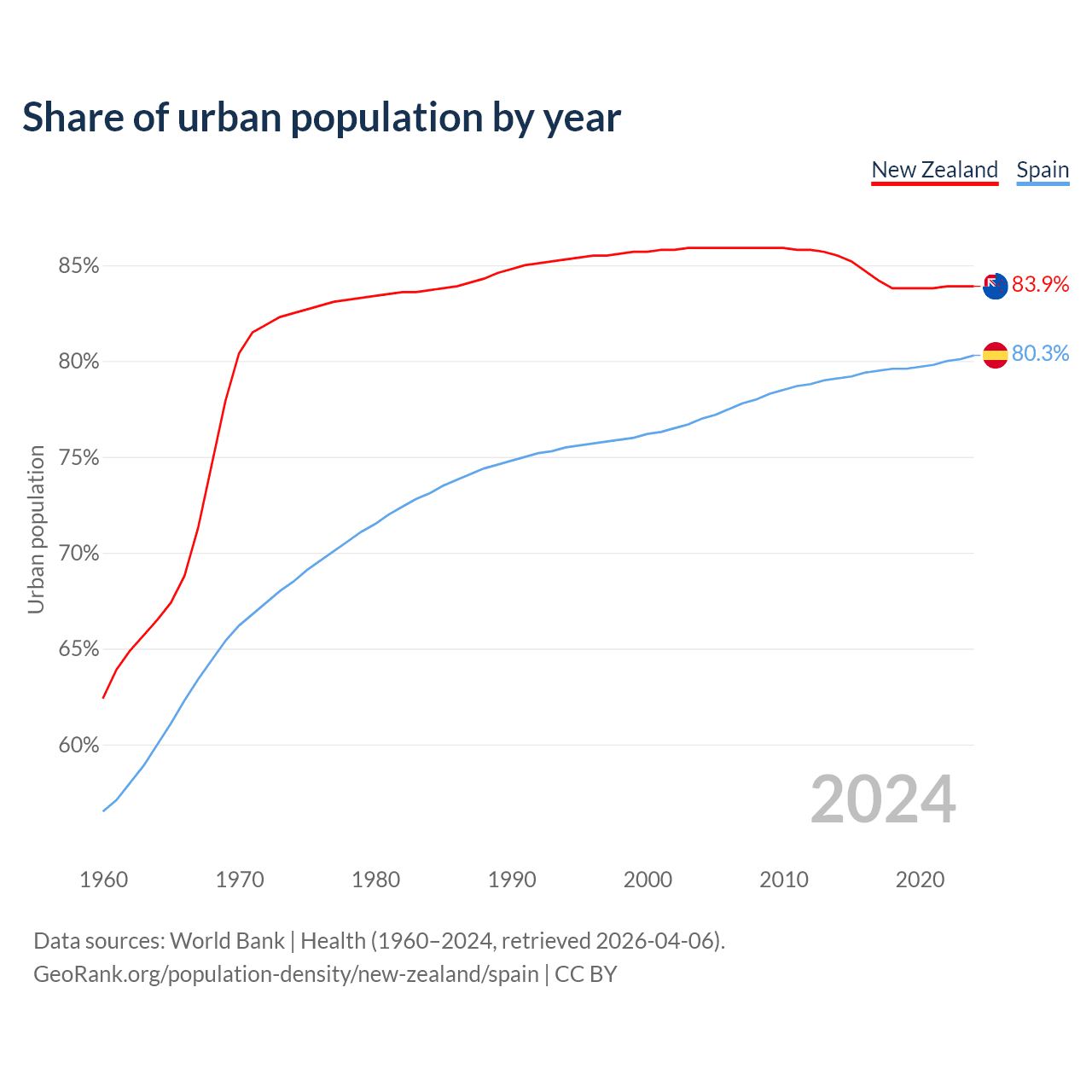 From 2004 to 2024, the share of urban population changed from 85.9% to 83.9% in New Zealand and from 77% to 80.3% in Spain.