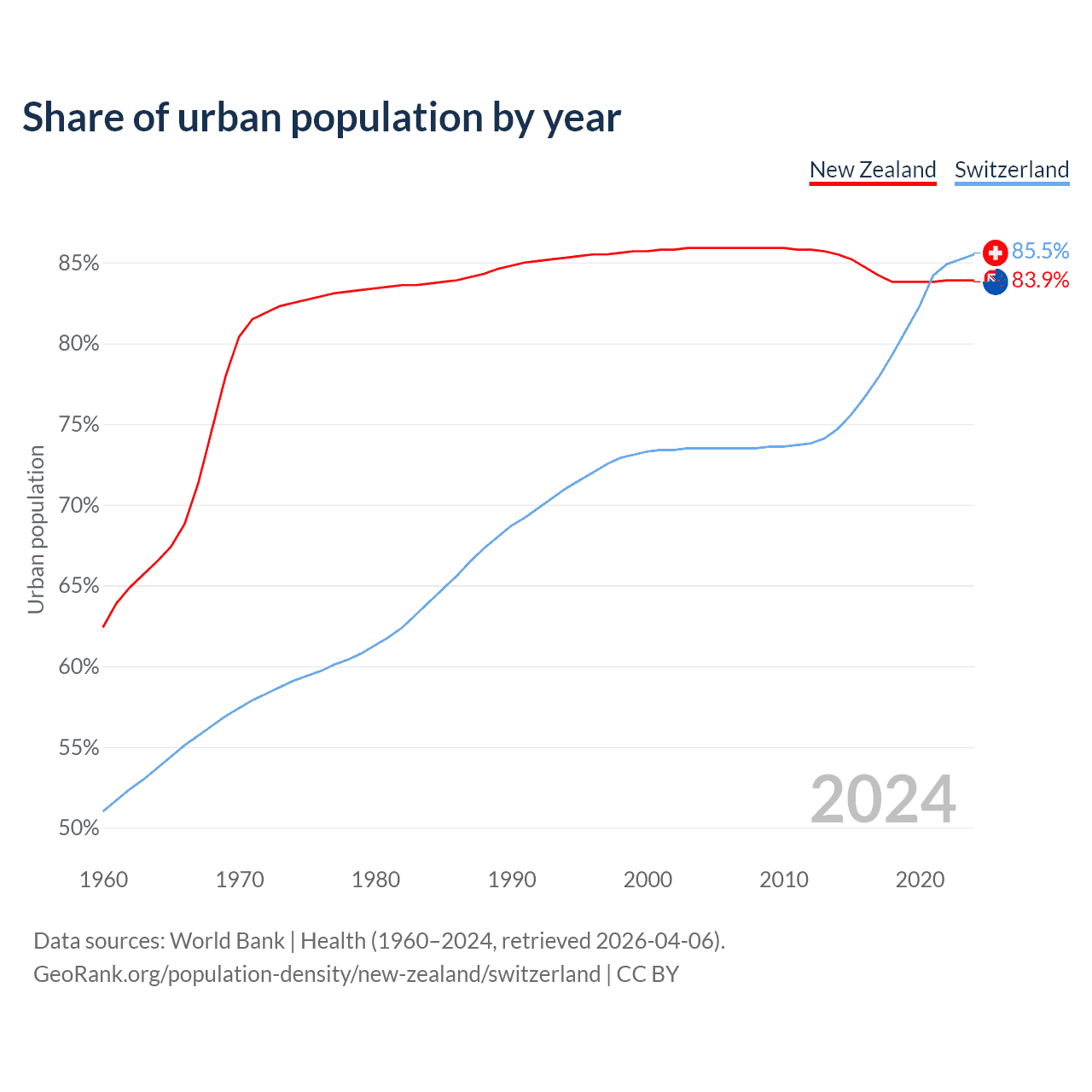 From 2004 to 2024, the share of urban population changed from 85.9% to 83.9% in New Zealand and from 73.5% to 85.5% in Switzerland.