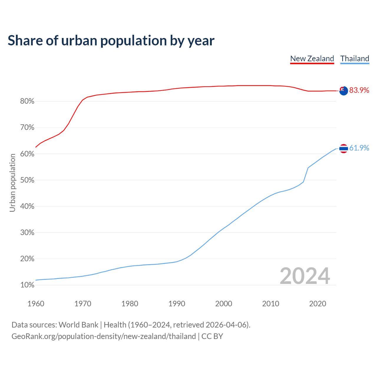 From 2004 to 2024, the share of urban population changed from 85.9% to 83.9% in New Zealand and from 36.8% to 61.9% in Thailand.