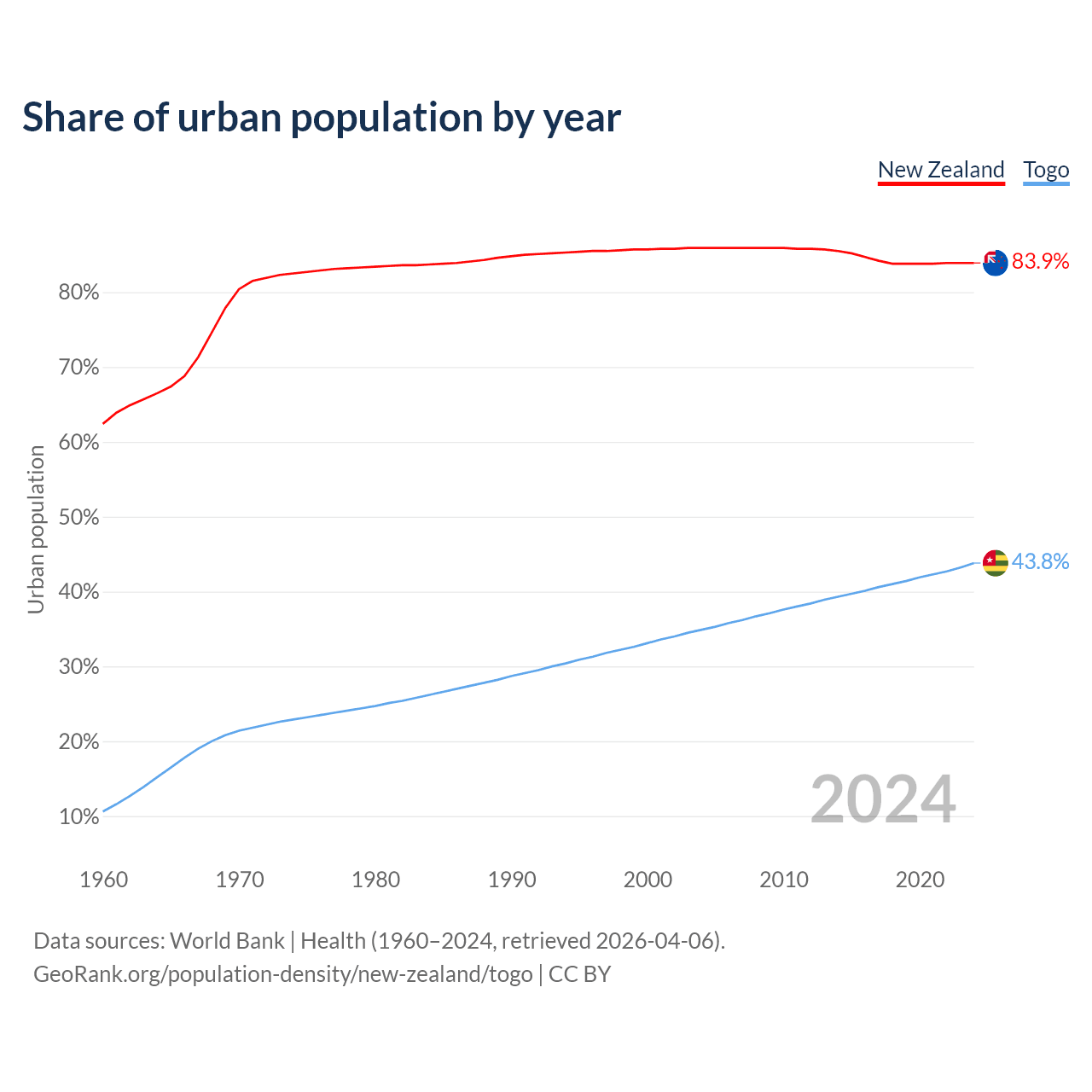 From 2004 to 2024, the share of urban population changed from 85.9% to 83.9% in New Zealand and from 34.9% to 43.8% in Togo.