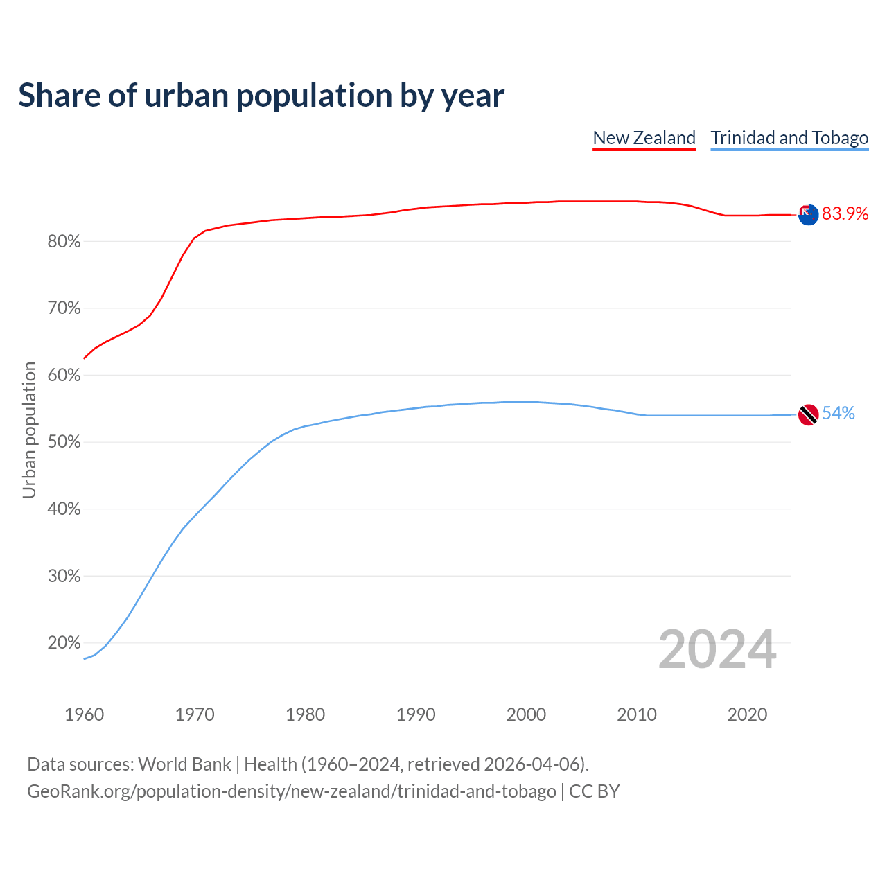 From 2004 to 2024, the share of urban population changed from 85.9% to 83.9% in New Zealand and from 55.6% to 54% in Trinidad and Tobago.