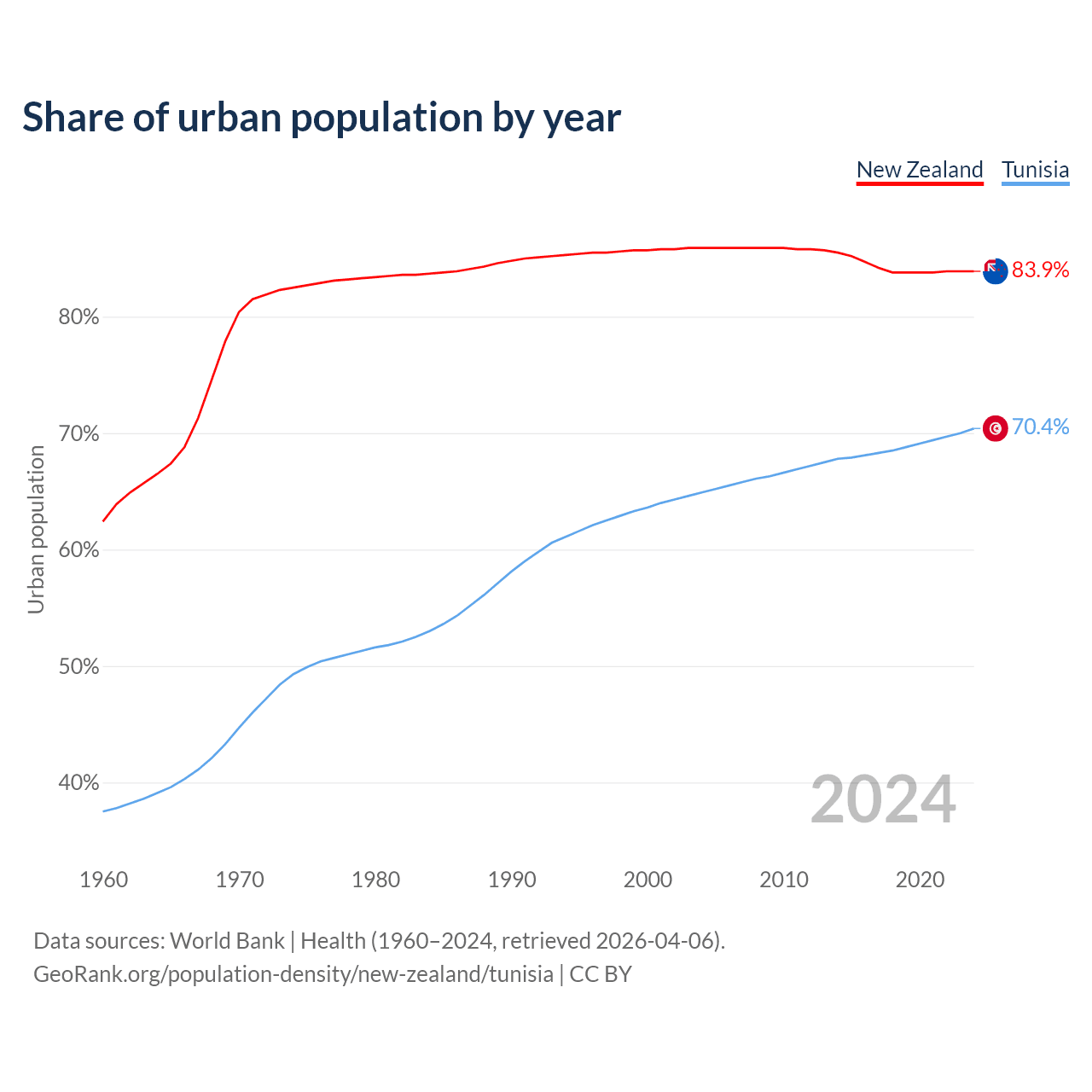 From 2004 to 2024, the share of urban population changed from 85.9% to 83.9% in New Zealand and from 64.9% to 70.4% in Tunisia.