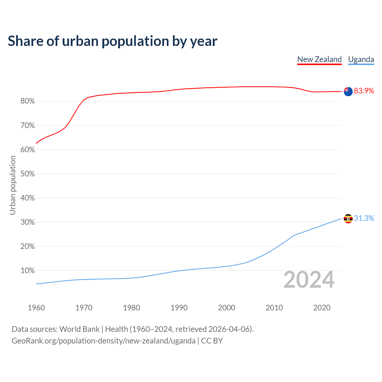 From 2004 to 2024, the share of urban population changed from 85.9% to 83.9% in New Zealand and from 13.1% to 31.3% in Uganda.
