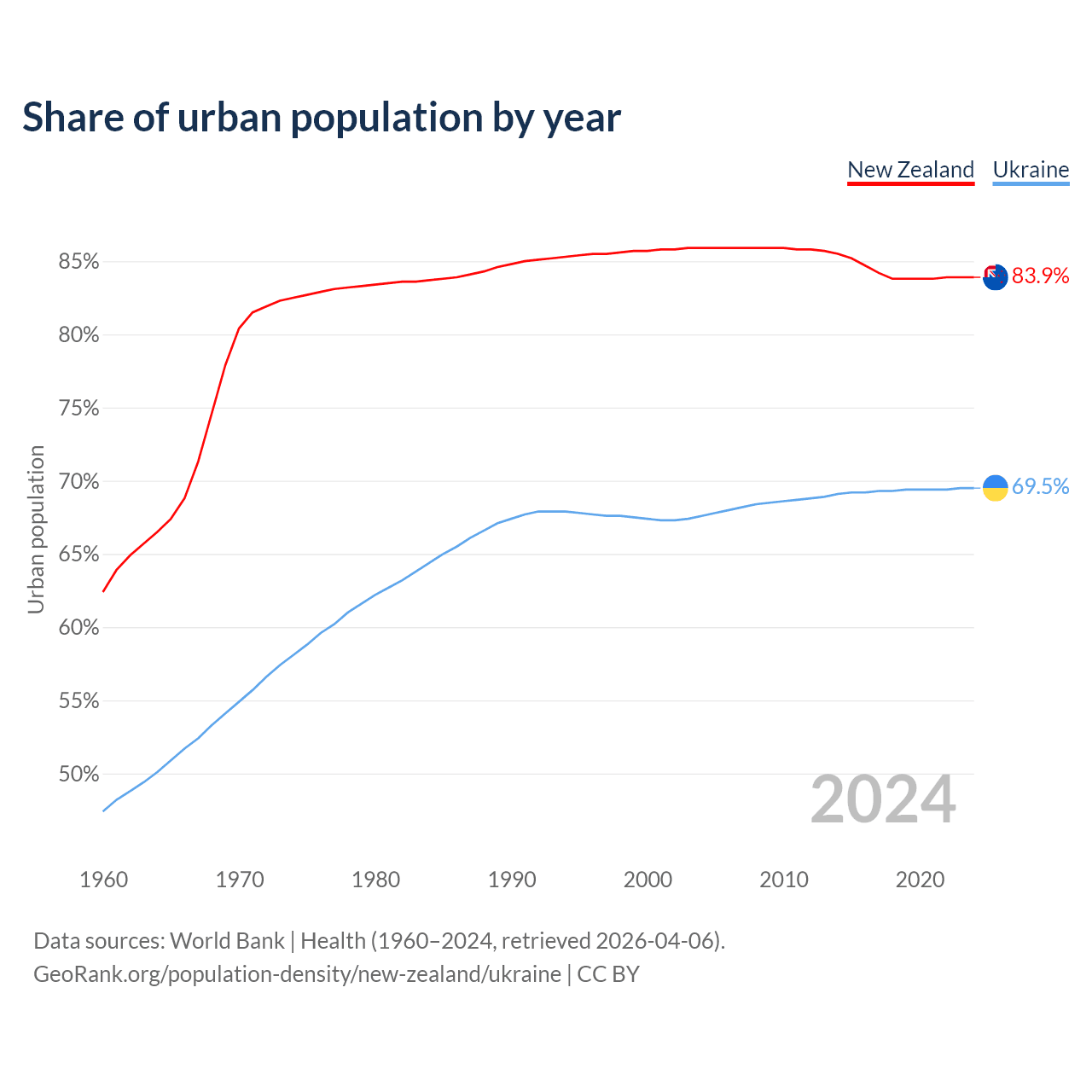 From 2004 to 2024, the share of urban population changed from 85.9% to 83.9% in New Zealand and from 67.6% to 69.5% in Ukraine.