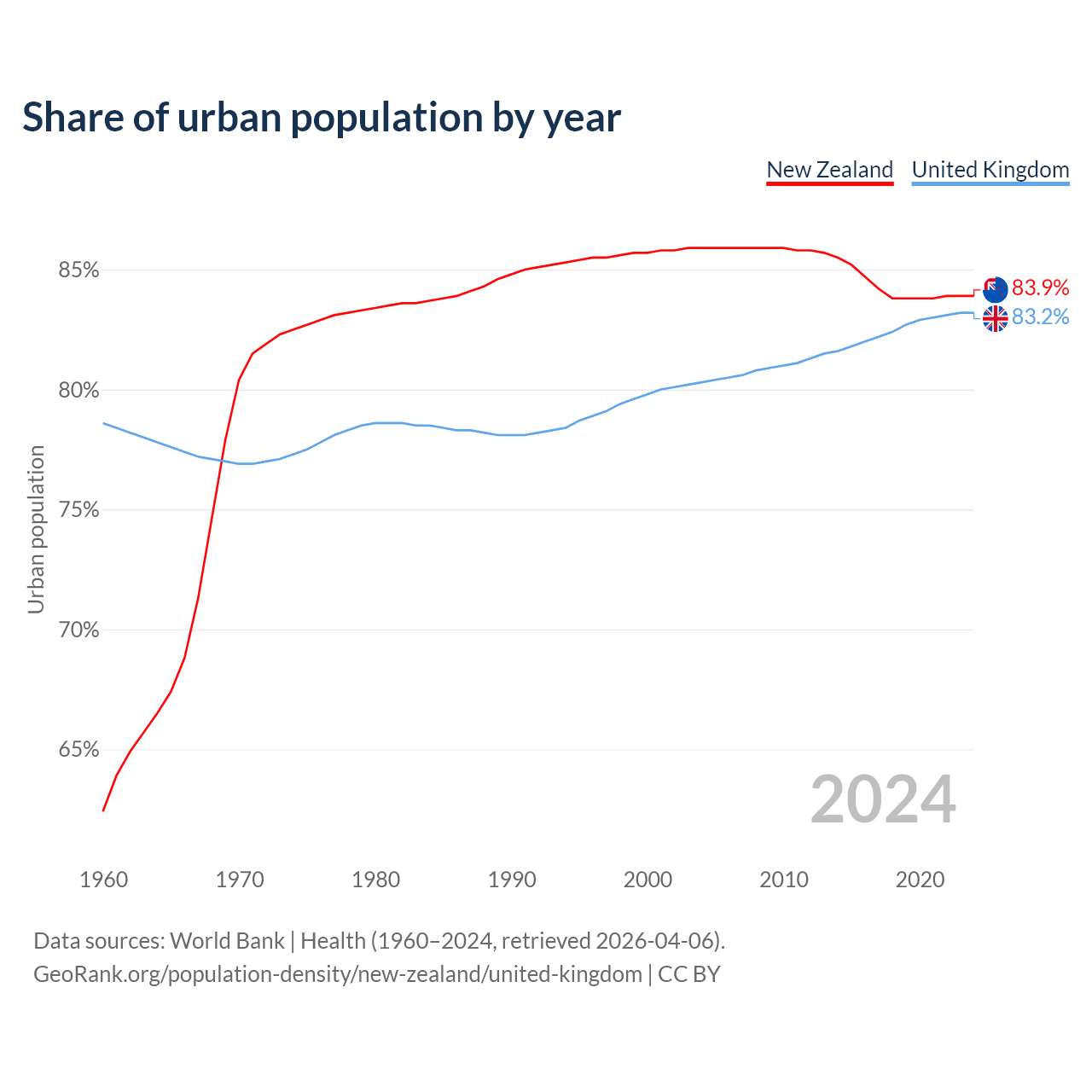 From 2004 to 2024, the share of urban population changed from 85.9% to 83.9% in New Zealand and from 80.3% to 83.2% in the United Kingdom.