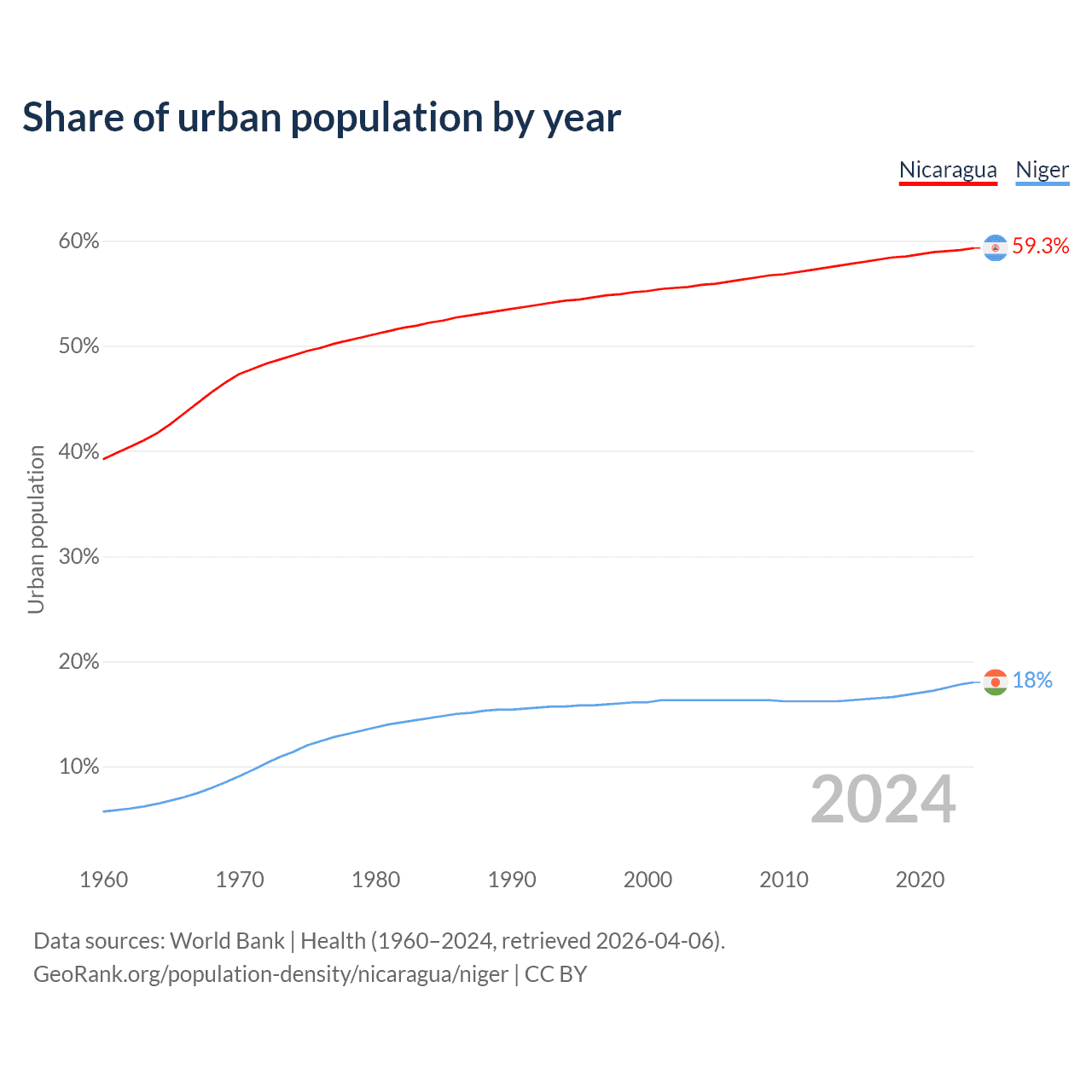 From 2004 to 2024, the share of urban population changed from 55.8% to 59.3% in Nicaragua and from 16.3% to 18% in Niger.