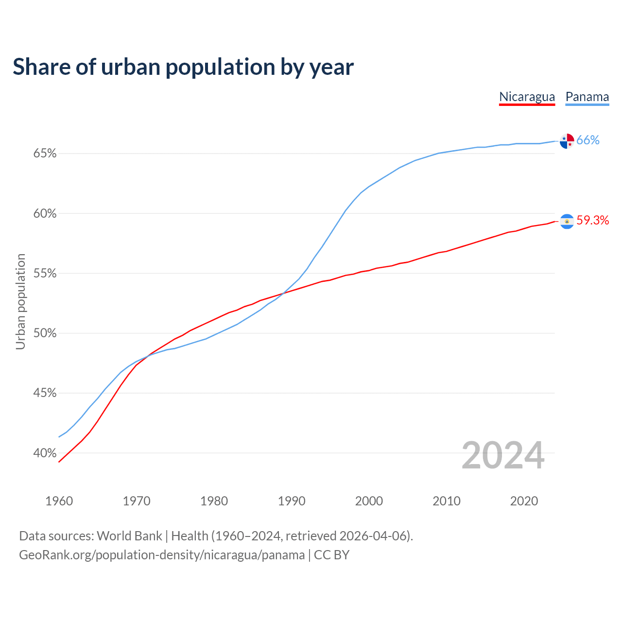 From 2004 to 2024, the share of urban population changed from 55.8% to 59.3% in Nicaragua and from 63.8% to 66% in Panama.
