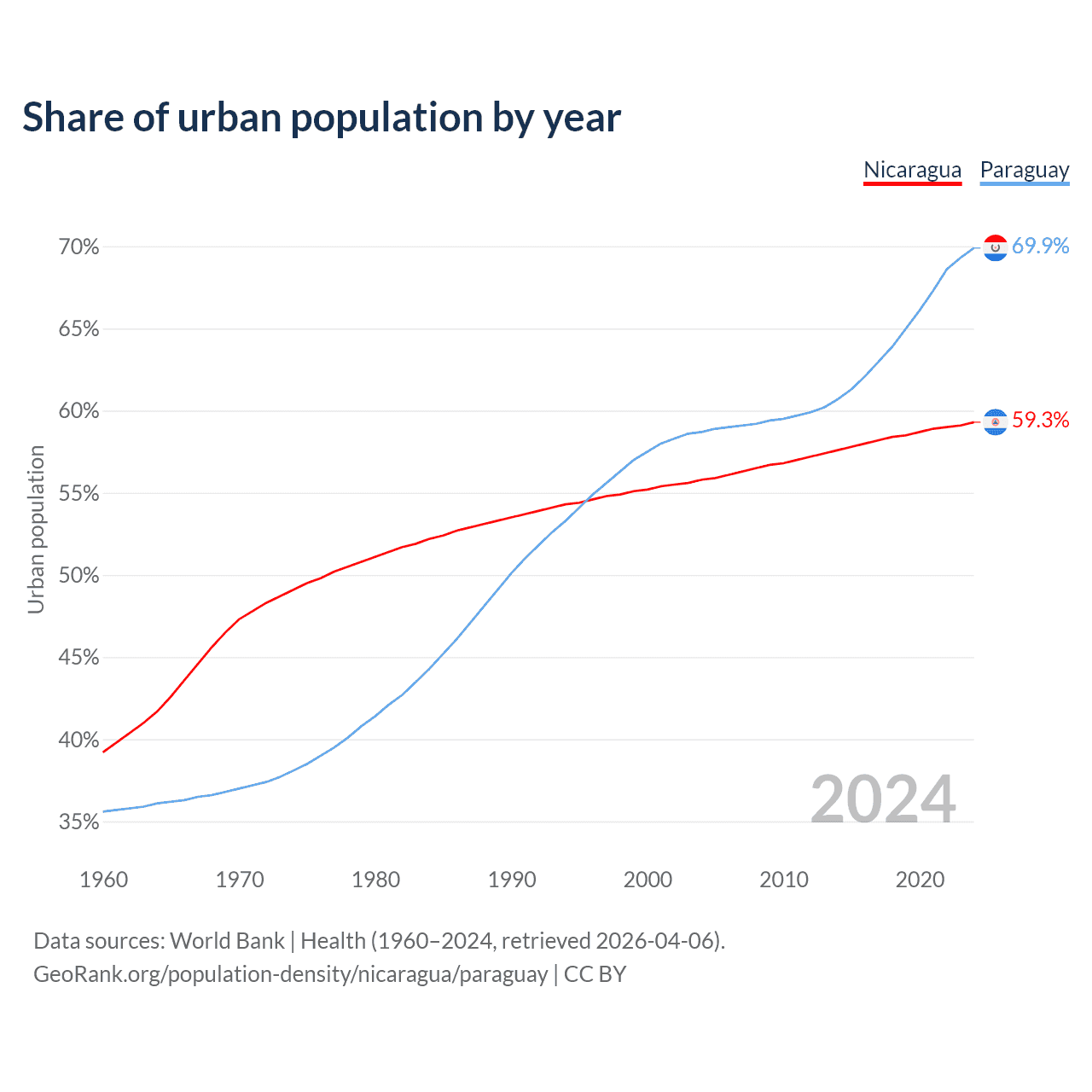 From 2004 to 2024, the share of urban population changed from 55.8% to 59.3% in Nicaragua and from 58.7% to 69.9% in Paraguay.