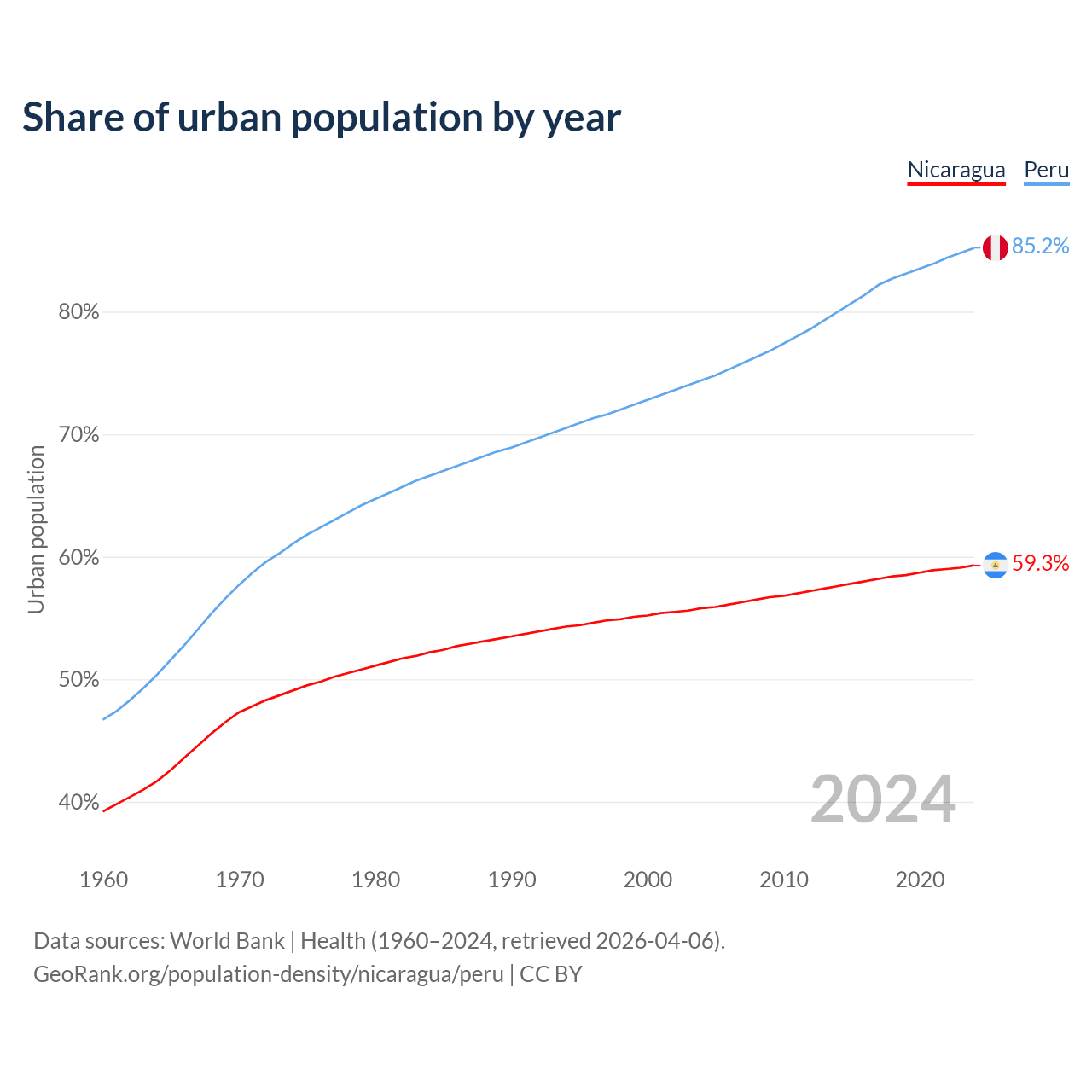 From 2004 to 2024, the share of urban population changed from 55.8% to 59.3% in Nicaragua and from 74.4% to 85.2% in Peru.