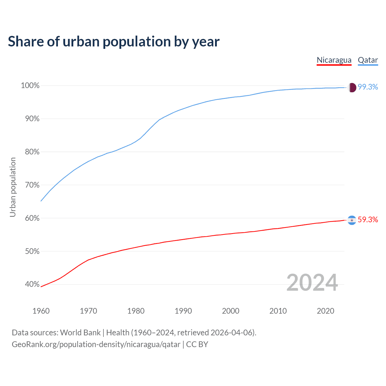 From 2004 to 2024, the share of urban population changed from 55.8% to 59.3% in Nicaragua and from 97% to 99.3% in Qatar.