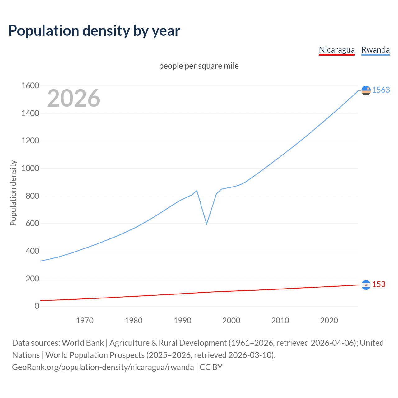 From 2006 to 2026, population density in Nicaragua increased by 31%, compared to a 60.1% growth in Rwanda.