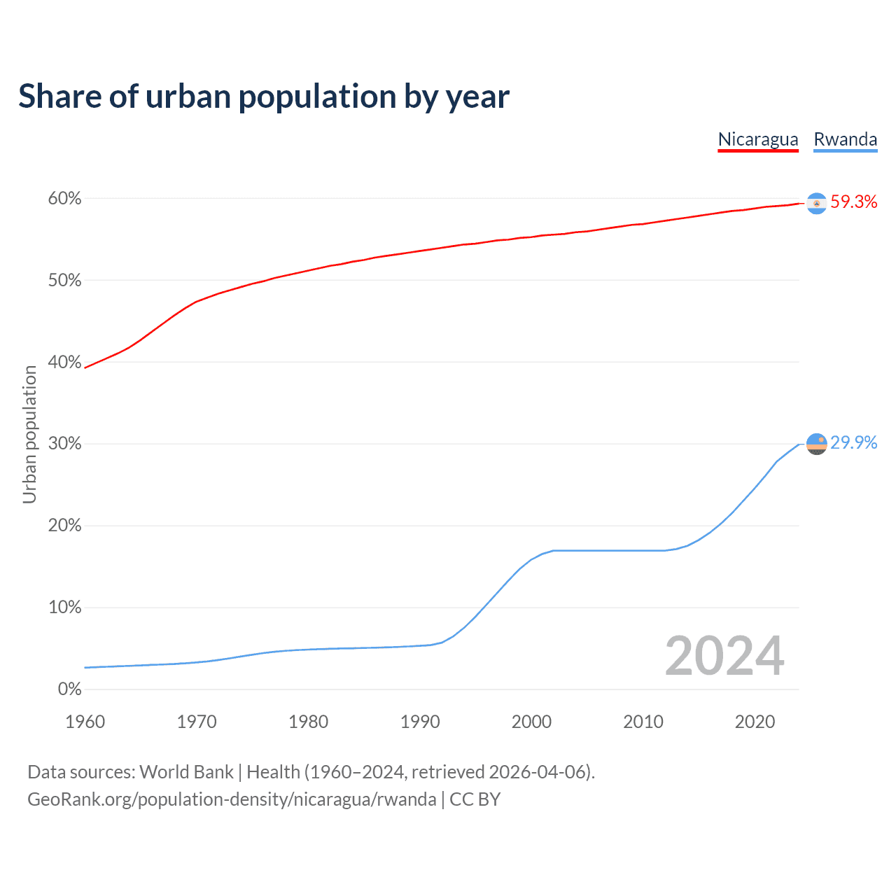 From 2004 to 2024, the share of urban population changed from 55.8% to 59.3% in Nicaragua and from 16.9% to 29.9% in Rwanda.