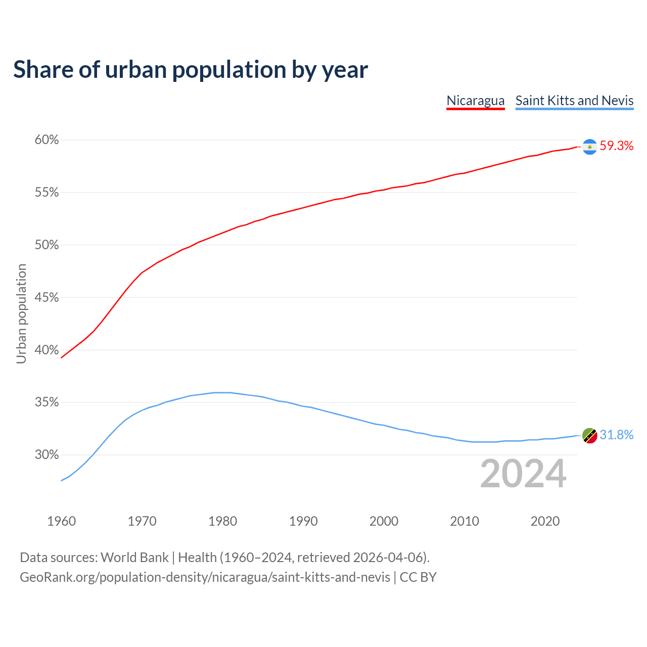 From 2004 to 2024, the share of urban population changed from 55.8% to 59.3% in Nicaragua and from 32.1% to 31.8% in Saint Kitts and Nevis.