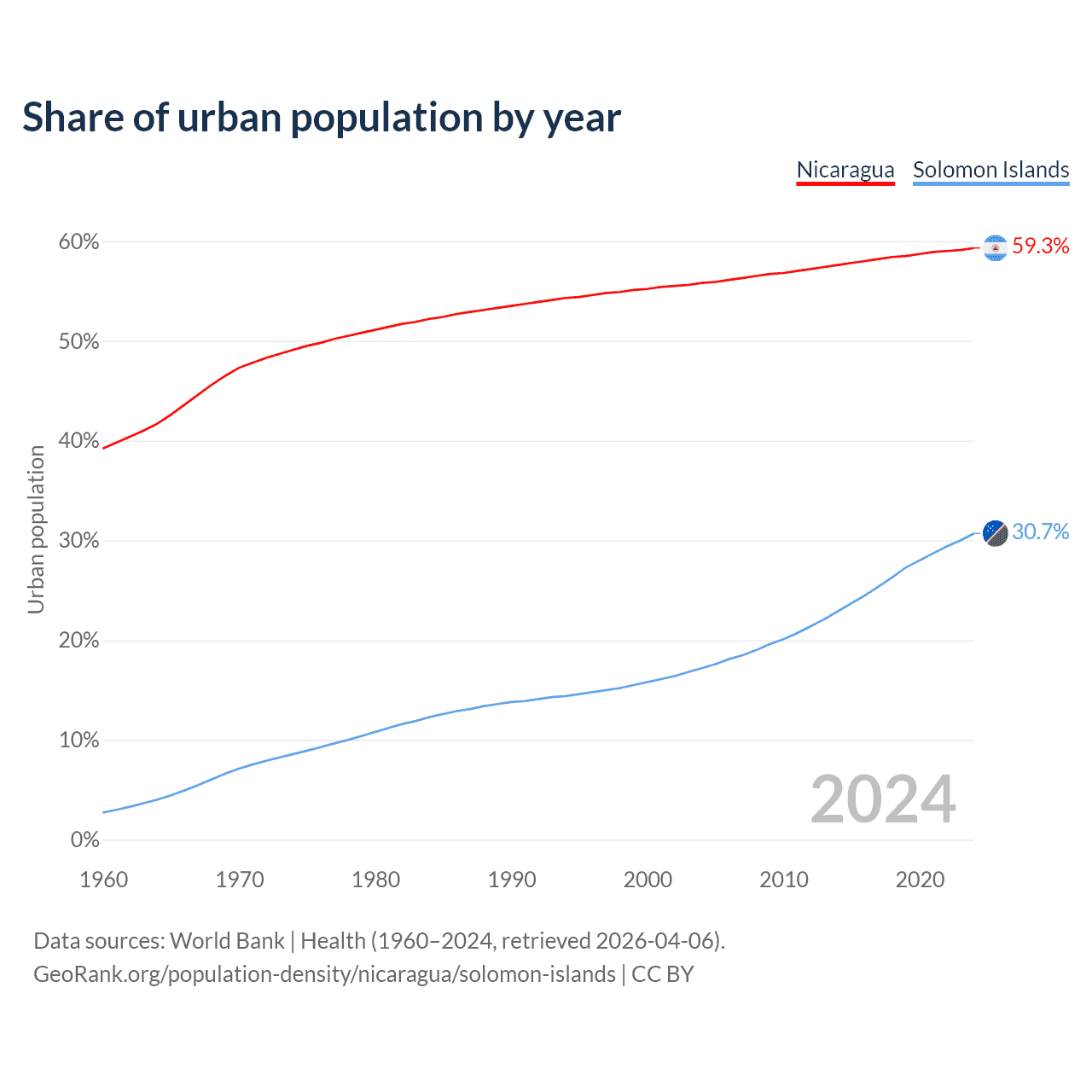 From 2004 to 2024, the share of urban population changed from 55.8% to 59.3% in Nicaragua and from 17.2% to 30.7% in the Solomon Islands.
