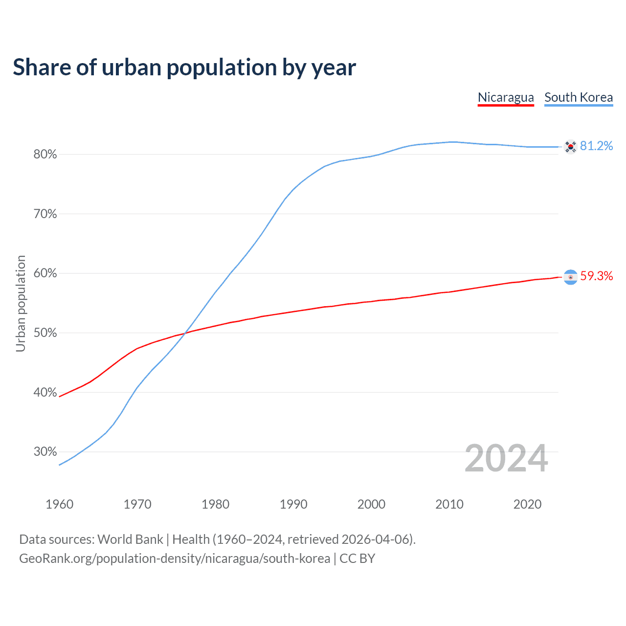 From 2004 to 2024, the share of urban population changed from 55.8% to 59.3% in Nicaragua and from 81.1% to 81.2% in South Korea.