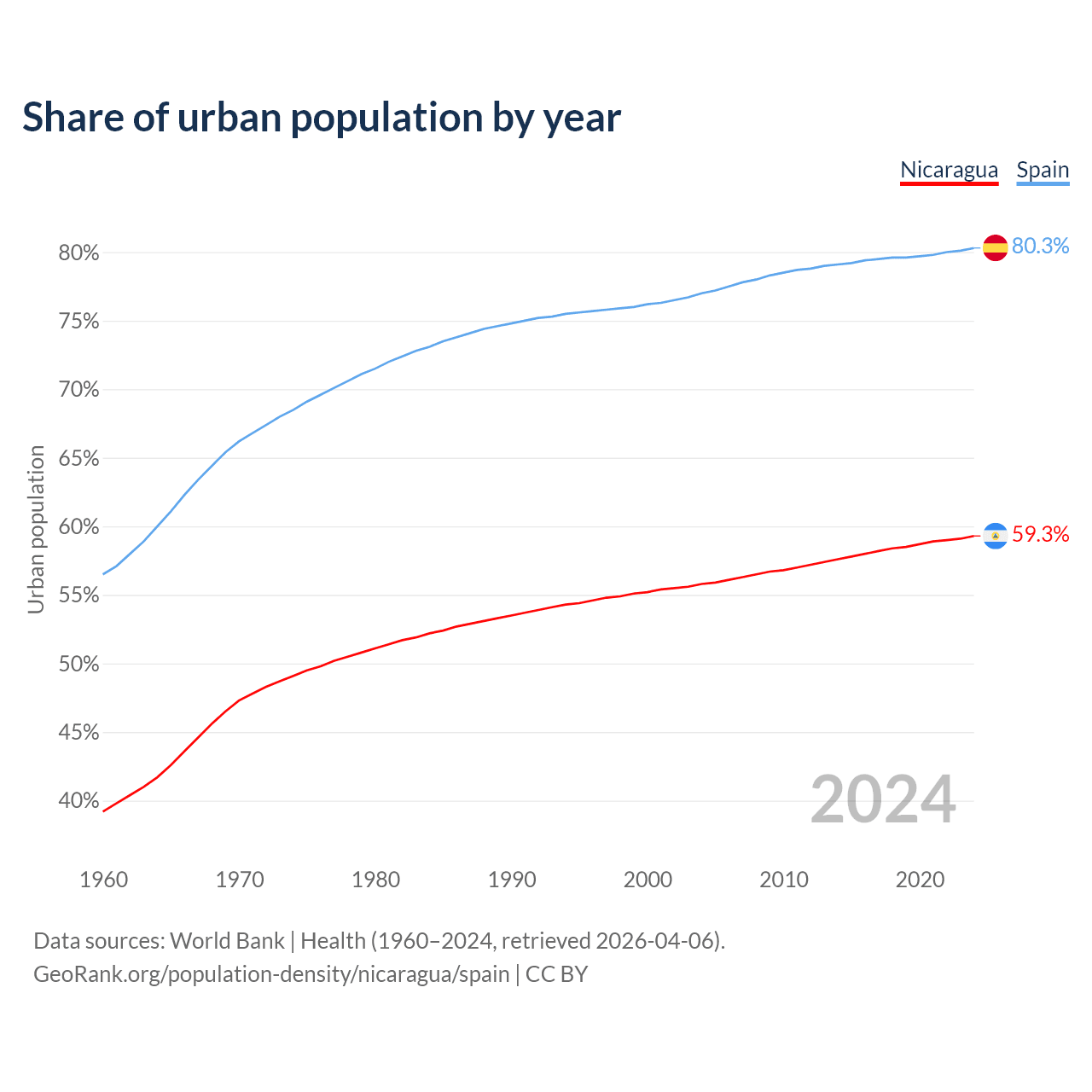 From 2004 to 2024, the share of urban population changed from 55.8% to 59.3% in Nicaragua and from 77% to 80.3% in Spain.