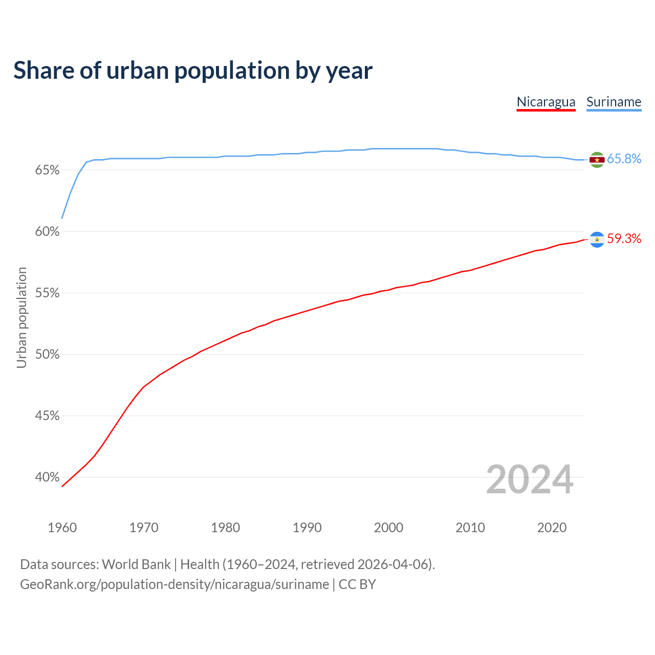 From 2004 to 2024, the share of urban population changed from 55.8% to 59.3% in Nicaragua and from 66.7% to 65.8% in Suriname.