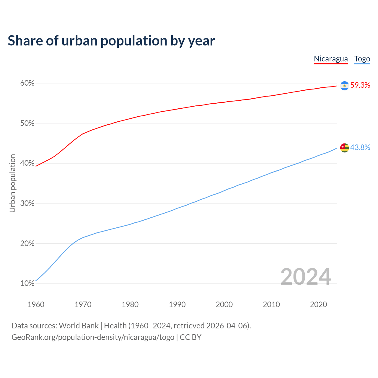 From 2004 to 2024, the share of urban population changed from 55.8% to 59.3% in Nicaragua and from 34.9% to 43.8% in Togo.
