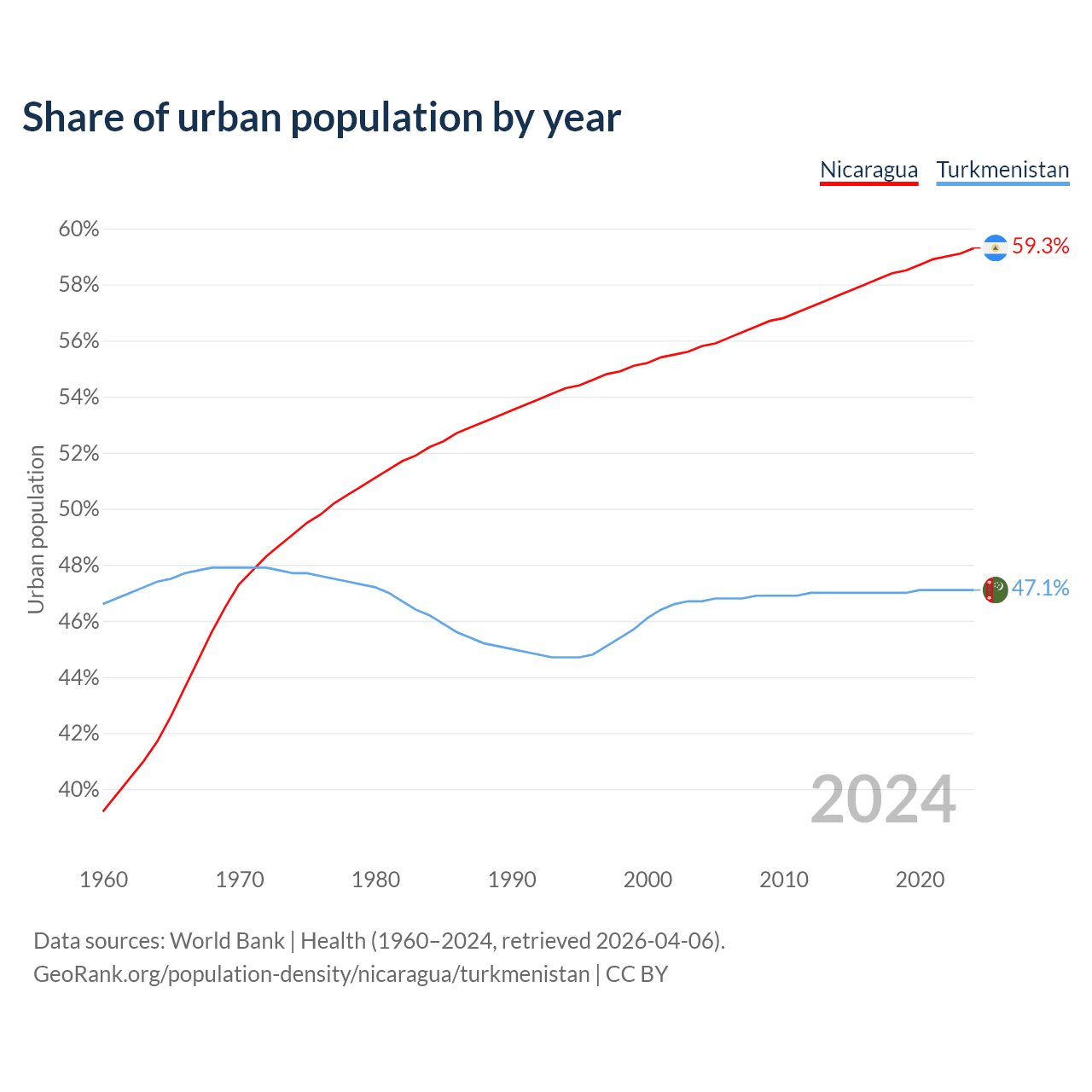 From 2004 to 2024, the share of urban population changed from 55.8% to 59.3% in Nicaragua and from 46.7% to 47.1% in Turkmenistan.
