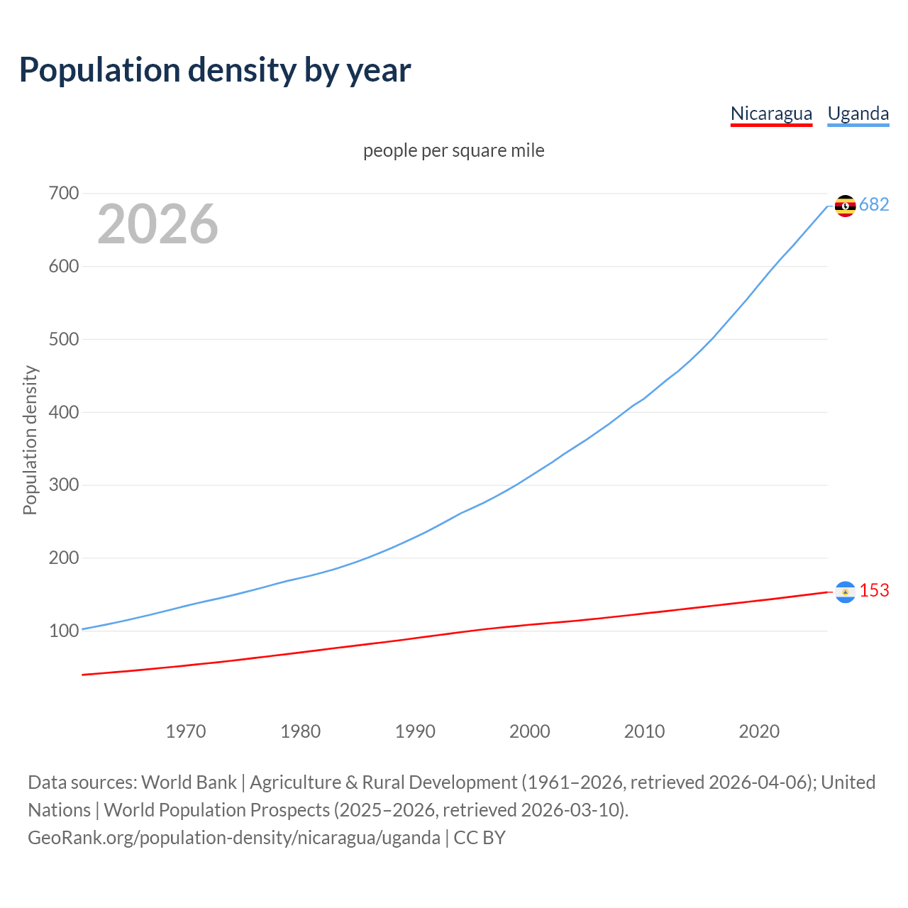 From 2006 to 2026, population density in Nicaragua increased by 31%, compared to a 82.7% growth in Uganda.