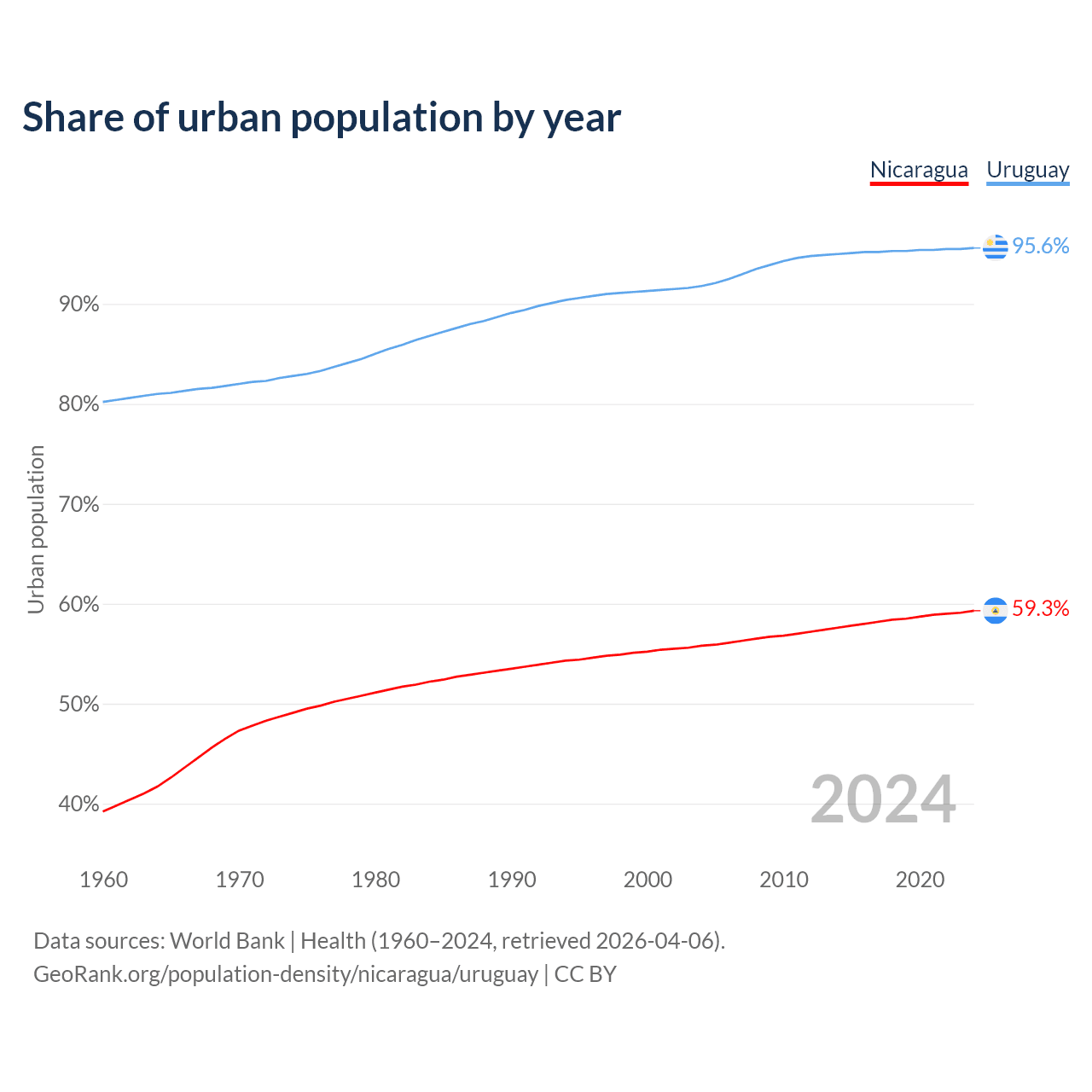 From 2004 to 2024, the share of urban population changed from 55.8% to 59.3% in Nicaragua and from 91.8% to 95.6% in Uruguay.