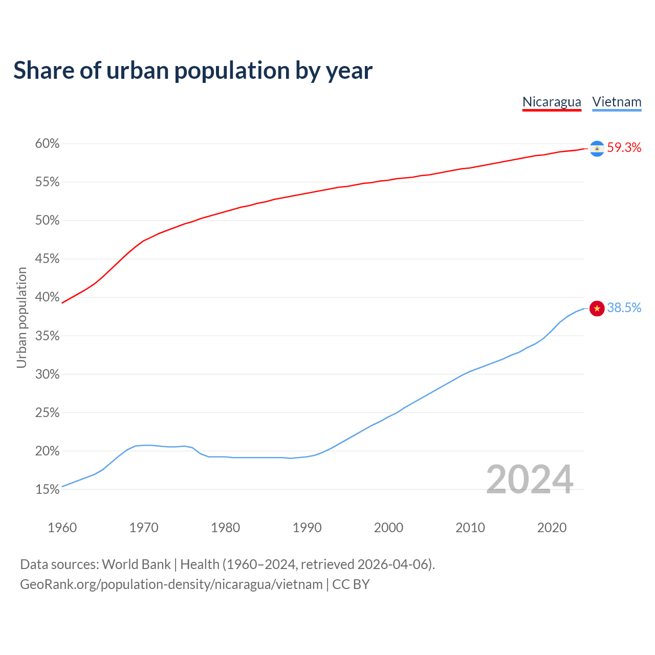 From 2004 to 2024, the share of urban population changed from 55.8% to 59.3% in Nicaragua and from 26.8% to 38.5% in Vietnam.