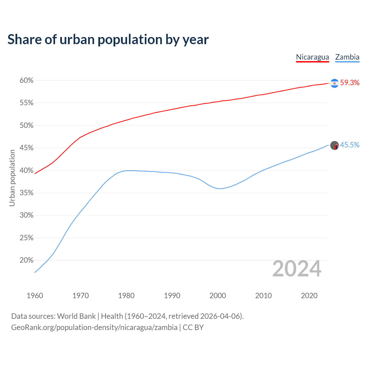 From 2004 to 2024, the share of urban population changed from 55.8% to 59.3% in Nicaragua and from 36.8% to 45.5% in Zambia.