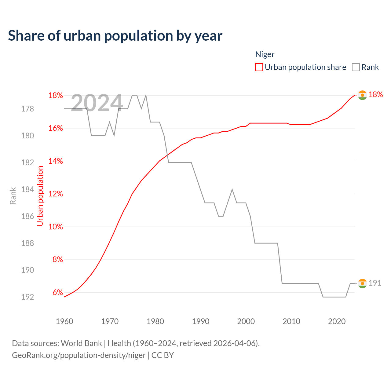 This chart shows the share of urban population in Niger from 1960 to 2024: 5.71% lived in urban areas in 1960, 16.1% in 2000, and 18% in 2024.