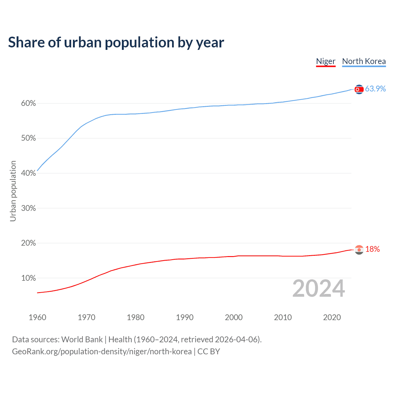 From 2004 to 2024, the share of urban population changed from 16.3% to 18% in Niger and from 59.7% to 63.9% in North Korea.