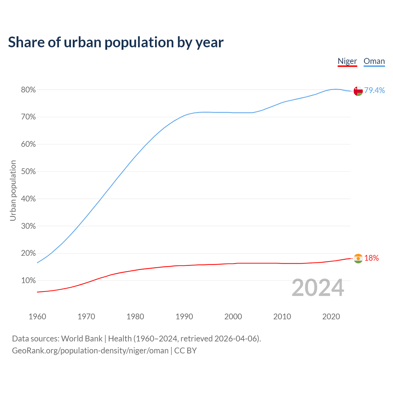 From 2004 to 2024, the share of urban population changed from 16.3% to 18% in Niger and from 71.5% to 79.4% in Oman.