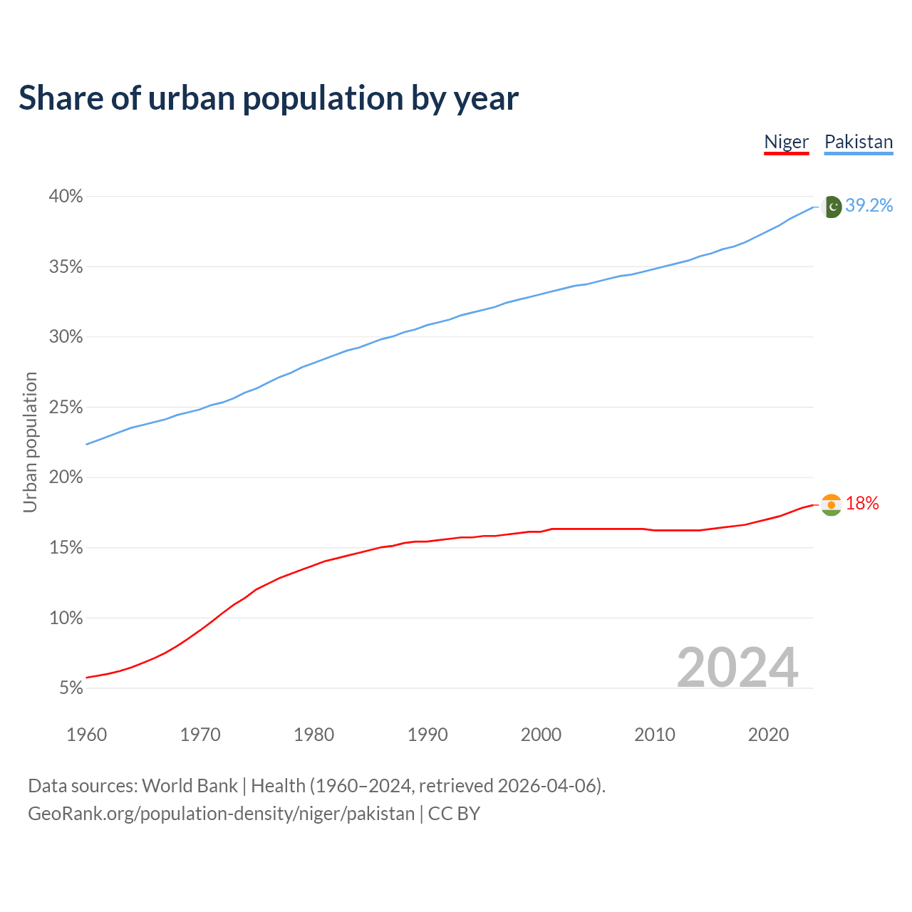 From 2004 to 2024, the share of urban population changed from 16.3% to 18% in Niger and from 33.7% to 39.2% in Pakistan.