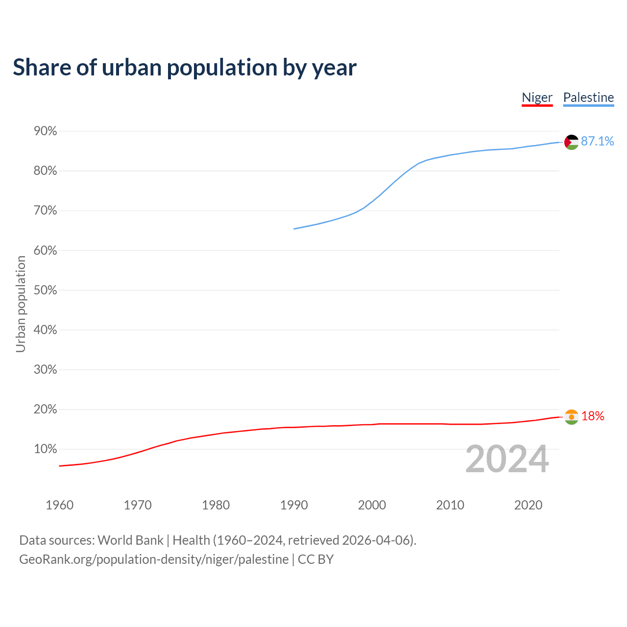 From 2004 to 2024, the share of urban population changed from 16.3% to 18% in Niger and from 79% to 87.1% in Palestine.