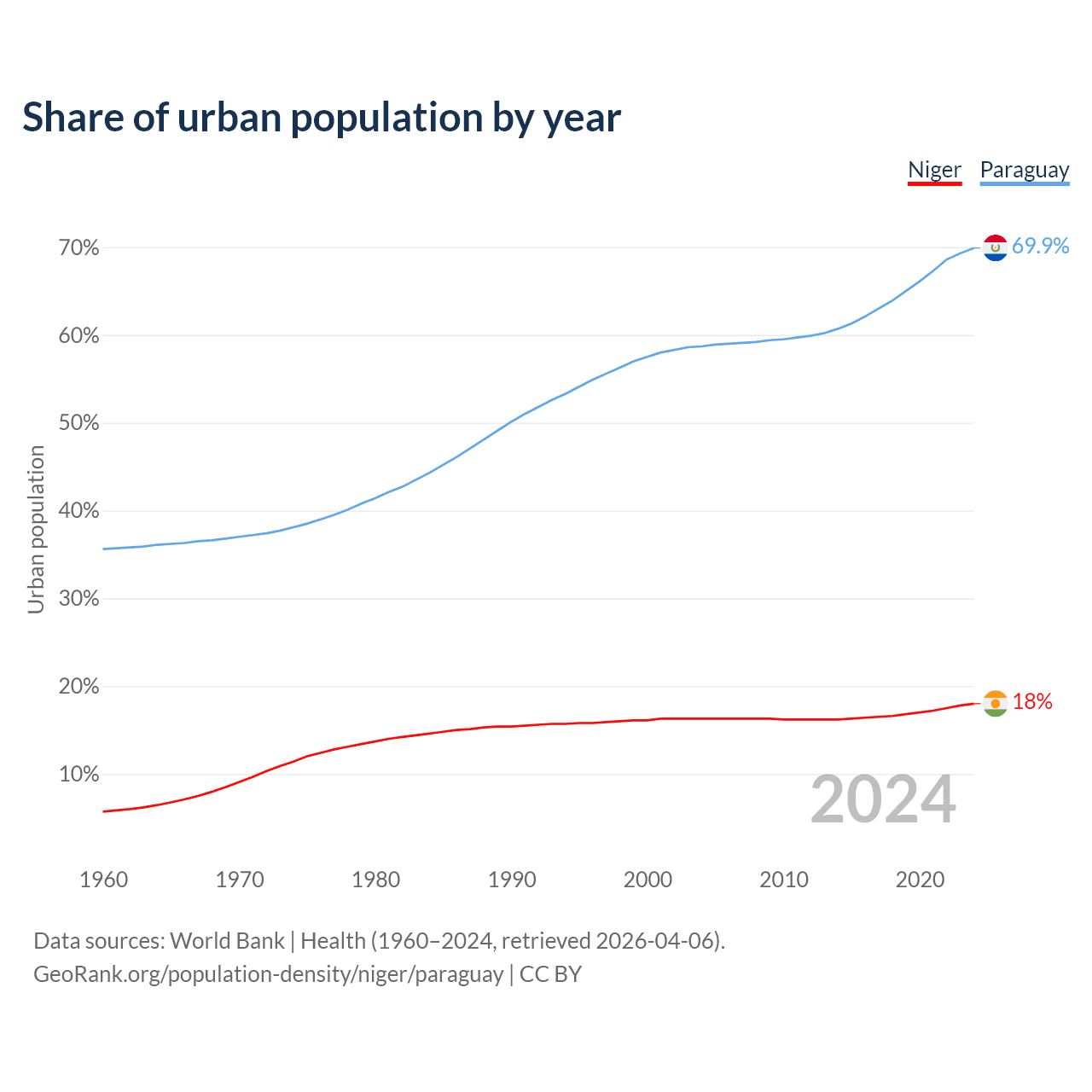 From 2004 to 2024, the share of urban population changed from 16.3% to 18% in Niger and from 58.7% to 69.9% in Paraguay.