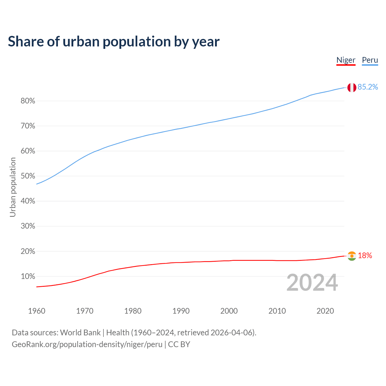 From 2004 to 2024, the share of urban population changed from 16.3% to 18% in Niger and from 74.4% to 85.2% in Peru.