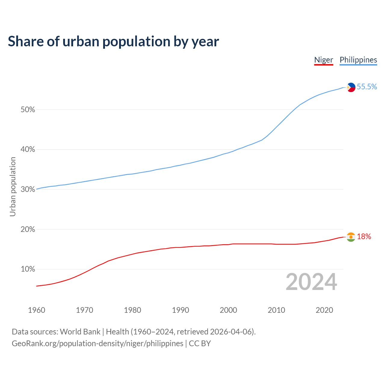 From 2004 to 2024, the share of urban population changed from 16.3% to 18% in Niger and from 40.9% to 55.5% in the Philippines.