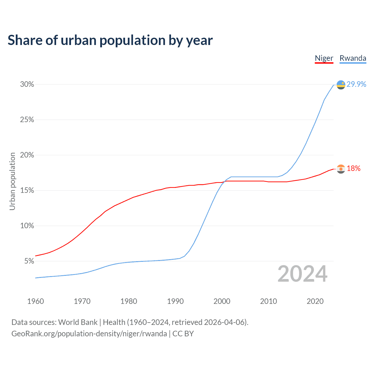 From 2004 to 2024, the share of urban population changed from 16.3% to 18% in Niger and from 16.9% to 29.9% in Rwanda.
