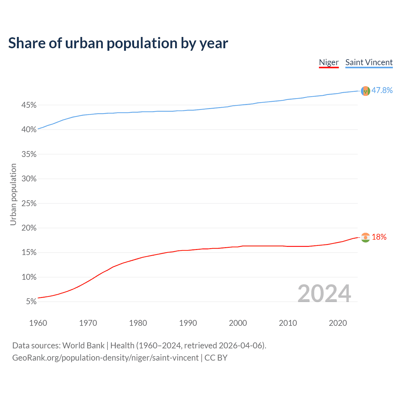 From 2004 to 2024, the share of urban population changed from 16.3% to 18% in Niger and from 45.4% to 47.8% in Saint Vincent.