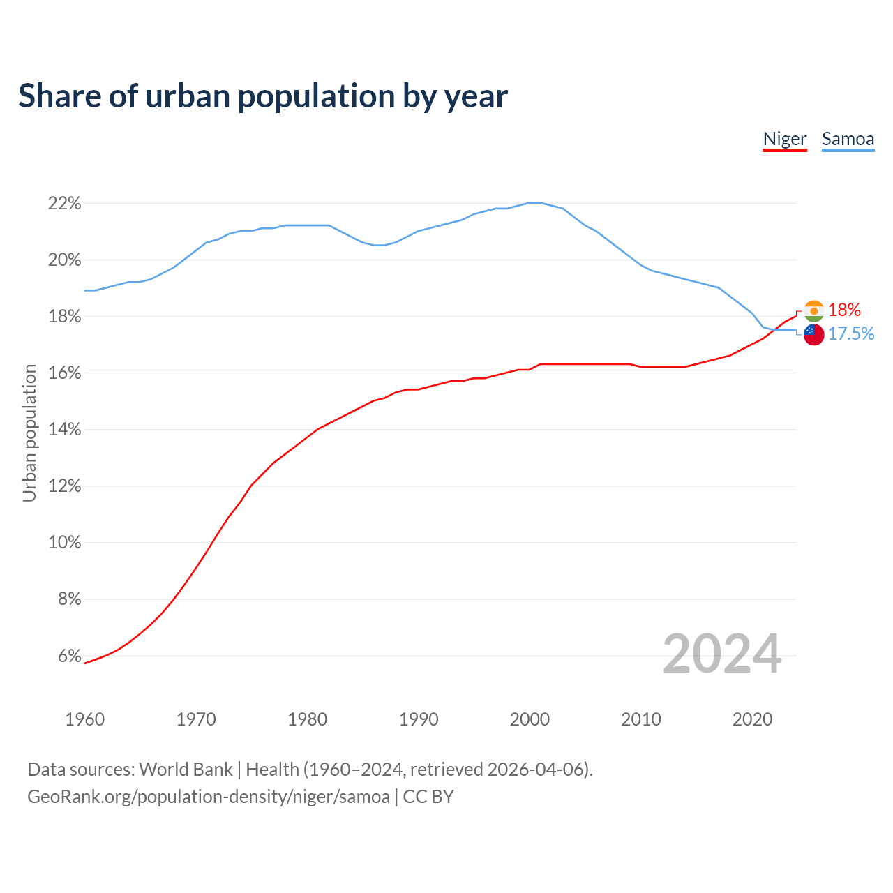 From 2004 to 2024, the share of urban population changed from 16.3% to 18% in Niger and from 21.5% to 17.5% in Samoa.