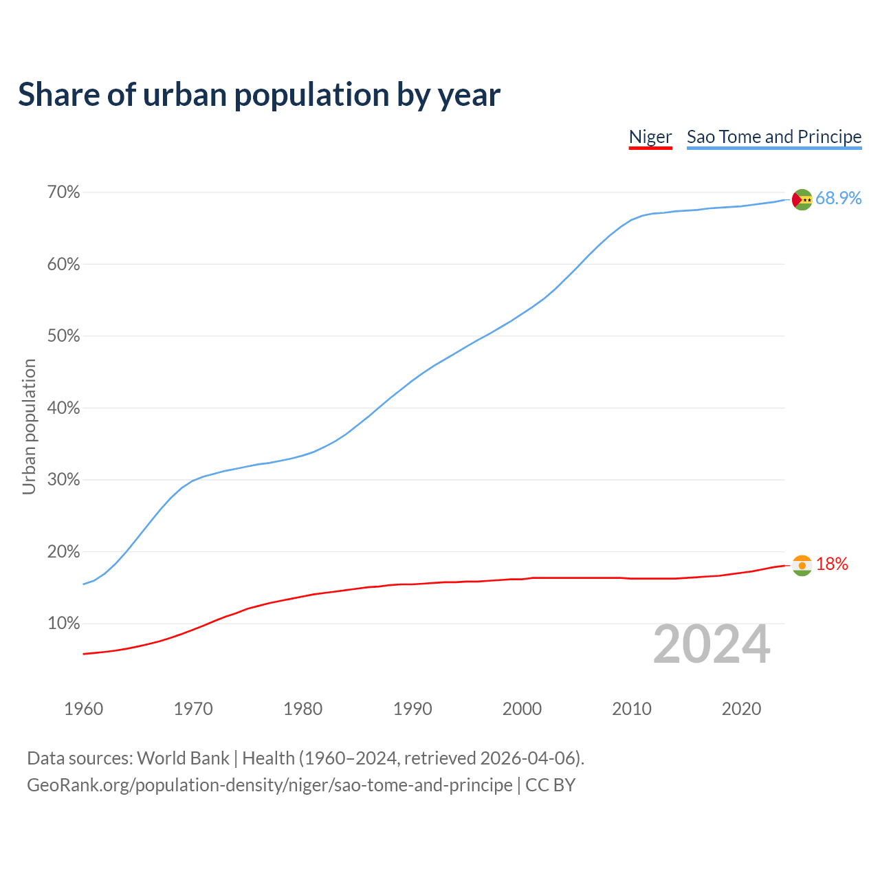 From 2004 to 2024, the share of urban population changed from 16.3% to 18% in Niger and from 57.9% to 68.9% in Sao Tome and Principe.